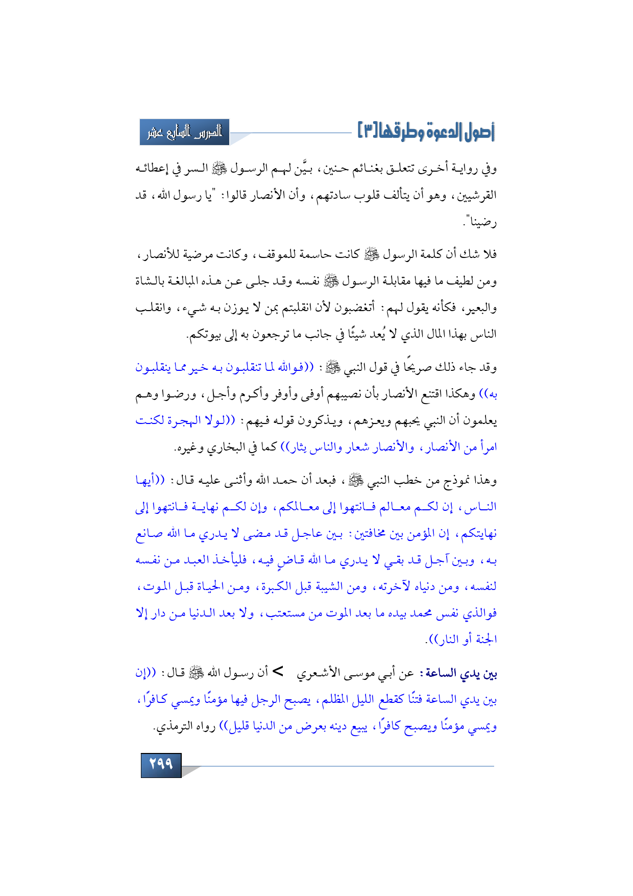 وقد جاء ذلك صريحًا في قول النبي -صلى الله عليه وسلم: ((فوالله لما تنقلبون به خير مما ينقلبون به)) وهكذا اقتنع الأنصار بأن نصيبهم أوفى وأوفر وأكرم وأجل، ورضوا وهم يعلمون أن النبي يحبهم ويعزهم، ويذكرون قوله فيهم: ((لولا الهجرة لكنت امرأ من الأنصار، والأنصار شعار والناس بِثار)) كما في البخاري وغيره.