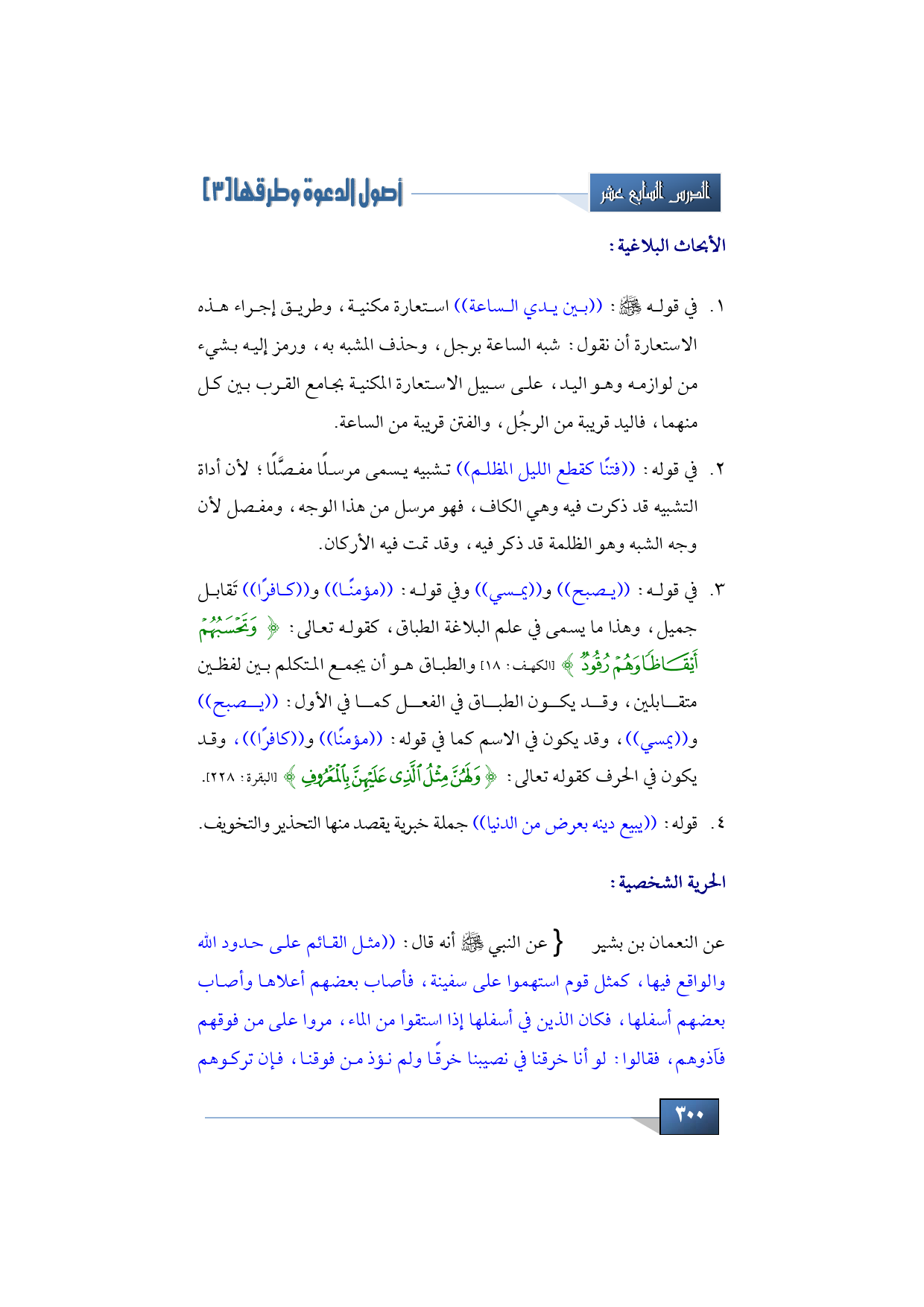 1 - في قوله -صلى الله عليه وسلم: ((بين يدي الساعة)) استعارة مكنية، وطريق إجراء هذه الاستعارة أن نقول: شبه الساعة برجل، وحذف المشبه به، ورمز إليه بشيء من لوازمه وهو اليد، على سبيل الاستعارة المكنية بجامع القرب بين كل منهما، فاليد قريبة من الرجُل، والفتن قريبة من الساعة.
