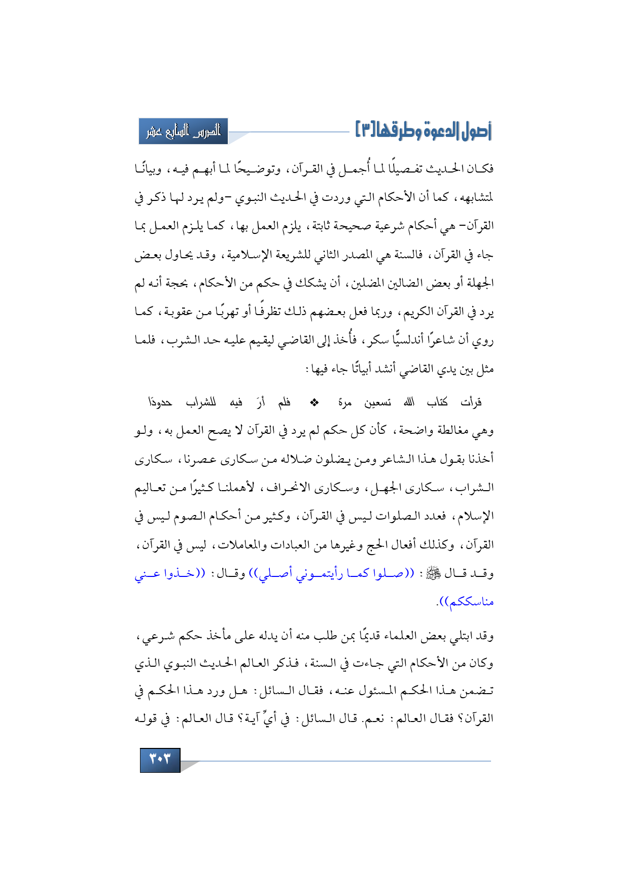 فكان الحديث تفصيلًا لما أُجمل في القرآن، وتوضيحًا لما أبهم فيه، وبيانًا لمتشابهه، كما أن الأحكام التي وردت في الحديث النبوي -ولم يرد لها ذكر في القرآن- هي أحكام شرعية صحيحة ثابتة، يلزم العمل بها، كما يلزم العمل بما جاء في القرآن، فالسنة هي المصدر الثاني للشريعة الإسلامية، وقد يحاول بعض الجهلة أو بعض الضالين المضلين، أن يشكك في حكم من الأحكام، بحجة أنه لم يرد في القرآن الكريم، وربما فعل بعضهم ذلك تظرفًا أو تهربًا من عقوبة، كما روي أن شاعرًا أندلسيًّا سكر، فأُخذ إلى القاضي ليقيم عليه حد الشرب، فلما مثل بين يدي القاضي أنشد أبياتًا جاء فيها: