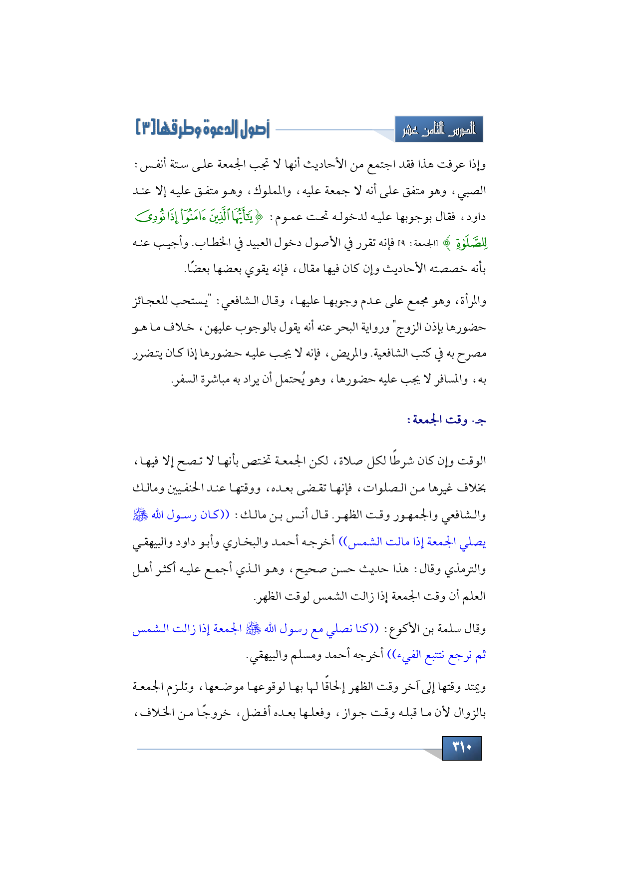 والمرأة، وهو مجمع على عدم وجوبها عليها، وقال الشافعي: "يستحب للعجائز حضورها بإذن الزوج" ورواية البحر عنه أنه يقول بالوجوب عليهن، خلاف ما هو مصرح به في كتب الشافعية. والمريض، فإنه لا يجب عليه حضورها إذا كان يتضرر به، والمسافر لا يجب عليه حضورها، وهو يُحتمل أن يراد به مباشرة السفر.