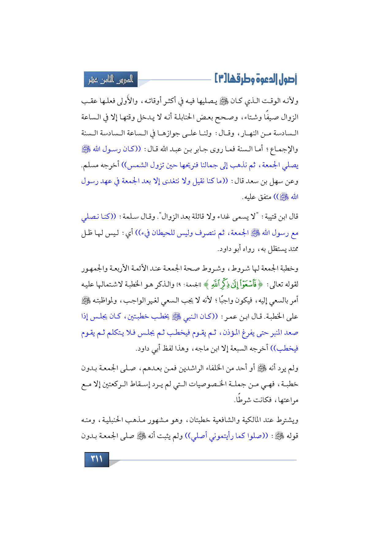 ولأنه الوقت الذي كان -صلى الله عليه وسلم- يصليها فيه في أكثر أوقاته، والأَولى فعلها عقب الزوال صيفًا وشتاء، وصحح بعض الحنابلة أنه لا يدخل وقتها إلا في الساعة السادسة من النهار، وقال: ولنا على جوازها في الساعة السادسة السنة والإجماع؛ أما السنة فما روى جابر بن عبد الله قال: ((كان رسول الله -صلى الله عليه وسلم- يصلي الجمعة، ثم نذهب إلى جمالنا فنريحها حين تزول الشمس)) أخرجه مسلم. وعن سهل بن سعد قال: ((ما كنا نقيل ولا نتغدى إلا بعد الجمعة في عهد رسول الله -صلى الله عليه وسلم)) متفق عليه.
