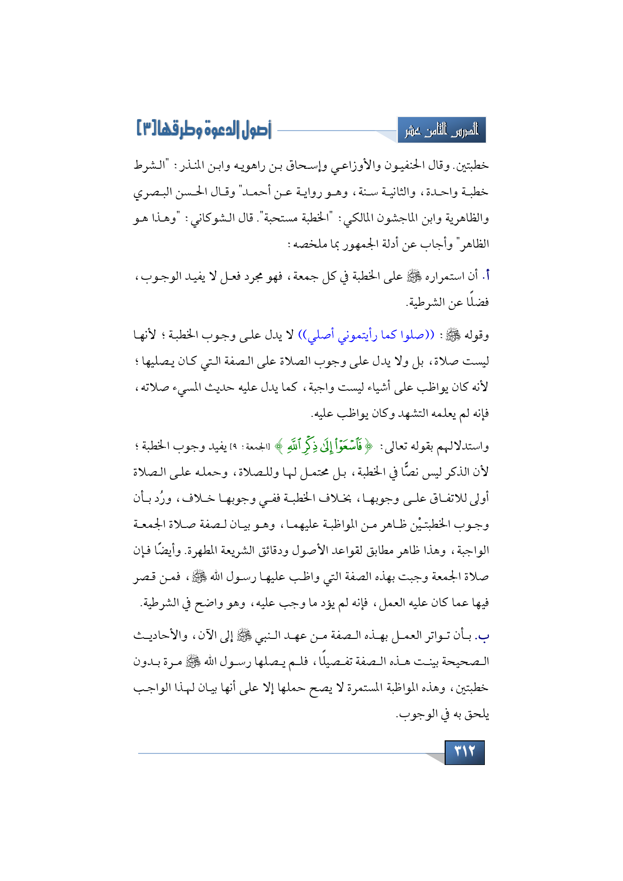 واستدلالهم بقوله تعالى: {فَاسْعَوْا إِلَى ذِكْرِ اللَّهِ} (الجمعة: 9) يفيد وجوب الخطبة؛ لأن الذكر ليس نصًّا في الخطبة، بل محتمل لها وللصلاة، وحمله على الصلاة أولى للاتفاق على وجوبها، بخلاف الخطبة ففي وجوبها خلاف، ورُد بأن وجوب الخطبتيْن ظاهر من المواظبة عليهما، وهو بيان لصفة صلاة الجمعة الواجبة، وهذا ظاهر مطابق لقواعد الأصول ودقائق الشريعة المطهرة. وأيضًا فإن صلاة الجمعة وجبت بهذه الصفة التي واظب عليها رسول الله -صلى الله عليه وسلم، فمن قصر فيها عما كان عليه العمل، فإنه لم يؤد ما وجب عليه، وهو واضح في الشرطية.