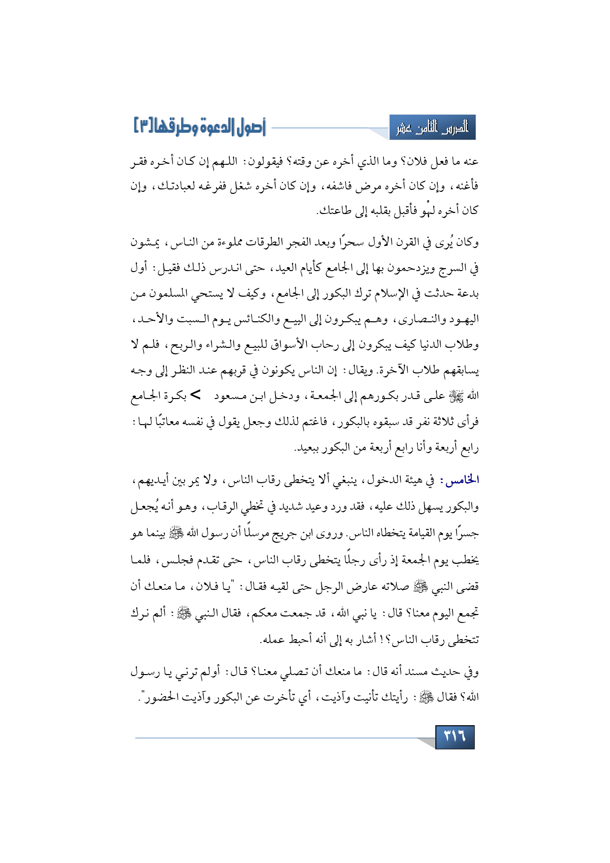 الخامس: في هيئة الدخول، ينبغي ألا يتخطى رقاب الناس، ولا يمر بين أيديهم، والبكور يسهل ذلك عليه، فقد ورد وعيد شديد في تخطي الرقاب، وهو أنه يُجعل جسرًا يوم القيامة يتخطاه الناس. وروى ابن جريج مرسلًا أن رسول الله -صلى الله عليه وسلم- بينما هو يخطب يوم الجمعة إذ رأى رجلًا يتخطى رقاب الناس، حتى تقدم فجلس، فلما قضى النبي -صلى الله عليه وسلم- صلاته عارض الرجل حتى لقيه فقال: "يا فلان، ما منعك أن تجمع اليوم معنا؟ قال: يا نبي الله، قد جمعت معكم، فقال النبي -صلى الله عليه وسلم: ألم نرك تتخطى رقاب الناس؟! أشار به إلى أنه أحبط عمله.