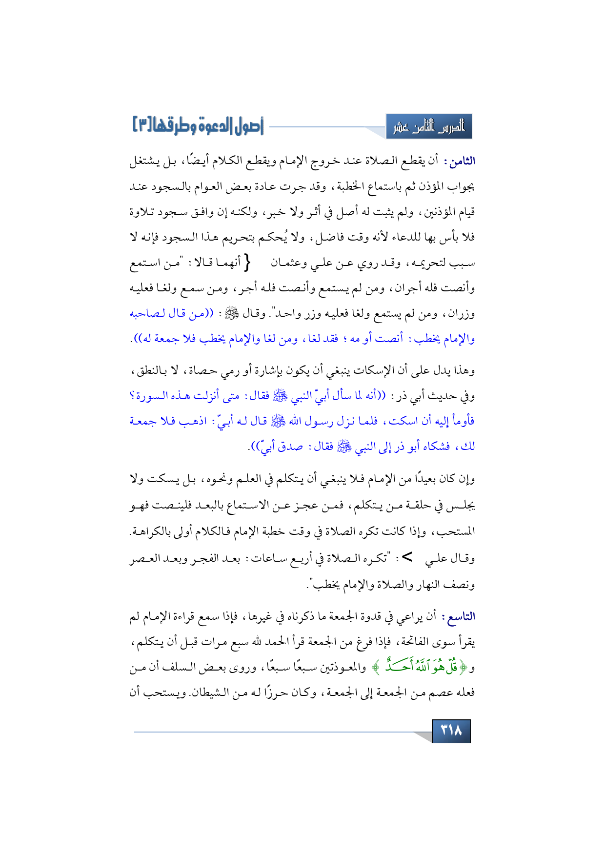 الثامن: أن يقطع الصلاة عند خروج الإمام ويقطع الكلام أيضًا، بل يشتغل بجواب المؤذن ثم باستماع الخطبة، وقد جرت عادة بعض العوام بالسجود عند قيام المؤذنين، ولم يثبت له أصل في أثر ولا خبر، ولكنه إن وافق سجود تلاوة فلا بأس بها للدعاء لأنه وقت فاضل، ولا يُحكم بتحريم هذا السجود فإنه لا سبب لتحريمه، وقد روي عن علي وعثمان -رضي الله عنهما- أنهما قالا: "من استمع وأنصت فله أجران، ومن لم يستمع وأنصت فله أجر، ومن سمع ولغا فعليه وزران، ومن لم يستمع ولغا فعليه وزر واحد". وقال -صلى الله عليه وسلم-: ((من قال لصاحبه والإمام يخطب: أنصت أو مه؛ فقد لغا، ومن لغا والإمام يخطب فلا جمعة له)).