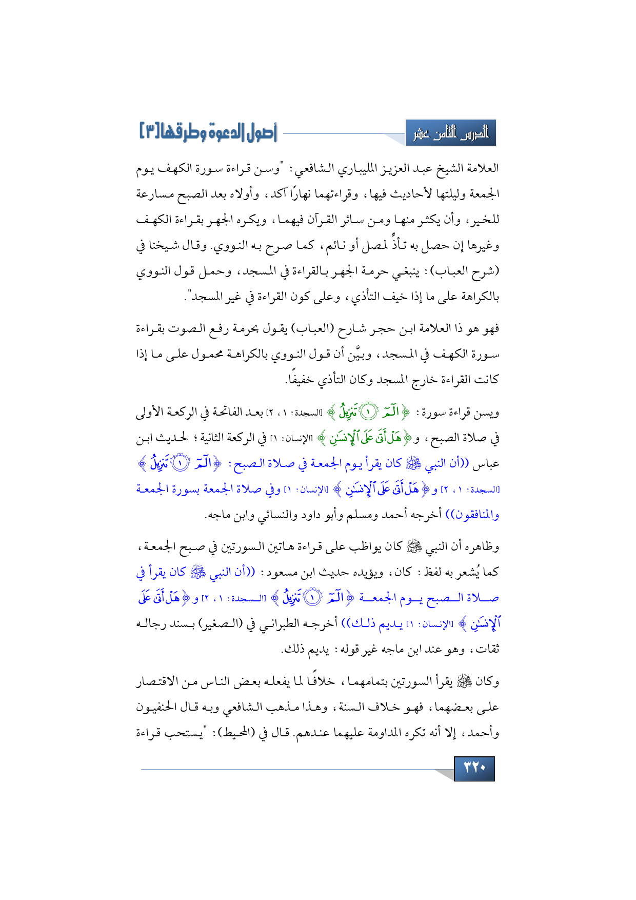 وظاهره أن النبي -صلى الله عليه وسلم- كان يواظب على قراءة هاتين السورتين في صبح الجمعة، كما يُشعر به لفظ: كان، ويؤيده حديث ابن مسعود: ((أن النبي -صلى الله عليه وسلم- كان يقرأ في صلاة الصبح يوم الجمعة {الم تَنْزِيلُ} (السجدة: 1، 2) و {هَلْ أَتَى عَلَى الْإِنْسَانِ} (الإنسان: 1) يديم ذلك)) أخرجه الطبراني في (الصغير) بسند رجاله ثقات، وهو عند ابن ماجه غير قوله: يديم ذلك.