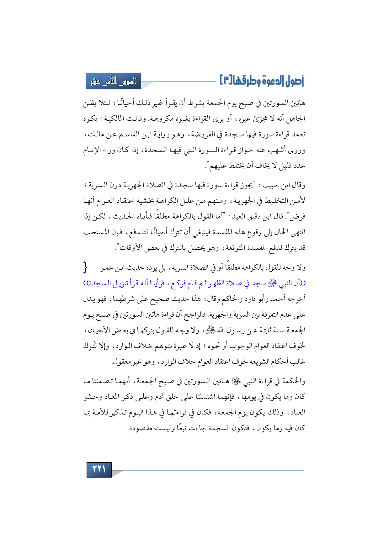 هاتين السورتين في صبح يوم الجمعة بشرط أن يقرأ غير ذلك أحيانًا؛ لئلا يظن الجاهل أنه لا مجزئ غيره، أو يرى القراءة بغيره مكروهة. وقالت المالكية: يكره تعمد قراءة سورة فيها سجدة في الفريضة، وهو رواية ابن القاسم عن مالك، وروى أشهب عنه جواز قراءة السورة التي فيها السجدة، إذا كان وراء الإمام عدد قليل لا يخاف أن يختلط عليهم".