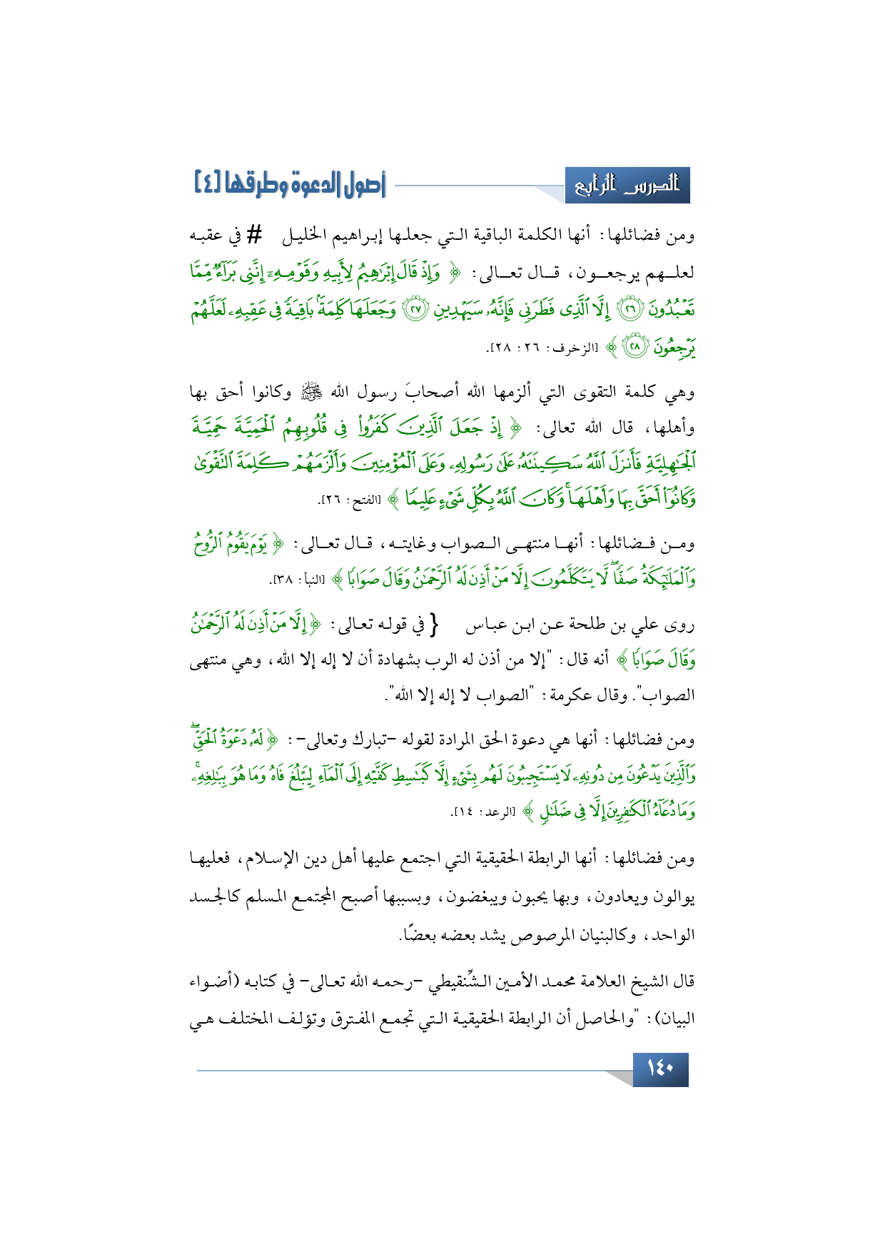 ومن فضائلها: أنها الكلمة الباقية التي جعلها إبراهيم الخليل -عليه السلام- في عقبه لعلهم يرجعون، قال تعالى: {وَإِذْ قَالَ إِبْرَاهِيمُ لأَبِيهِ وَقَوْمِهِ إِنَّنِي بَرَاءٌ مِمَّا تَعْبُدُونَ إِلاَّ الَّذِي فَطَرَنِي فَإِنَّهُ سَيَهْدِينِ وَجَعَلَهَا كَلِمَةً بَاقِيَةً فِي عَقِبِهِ لَعَلَّهُمْ يَرْجِعُونَ} (الزخرف: 26: 28).