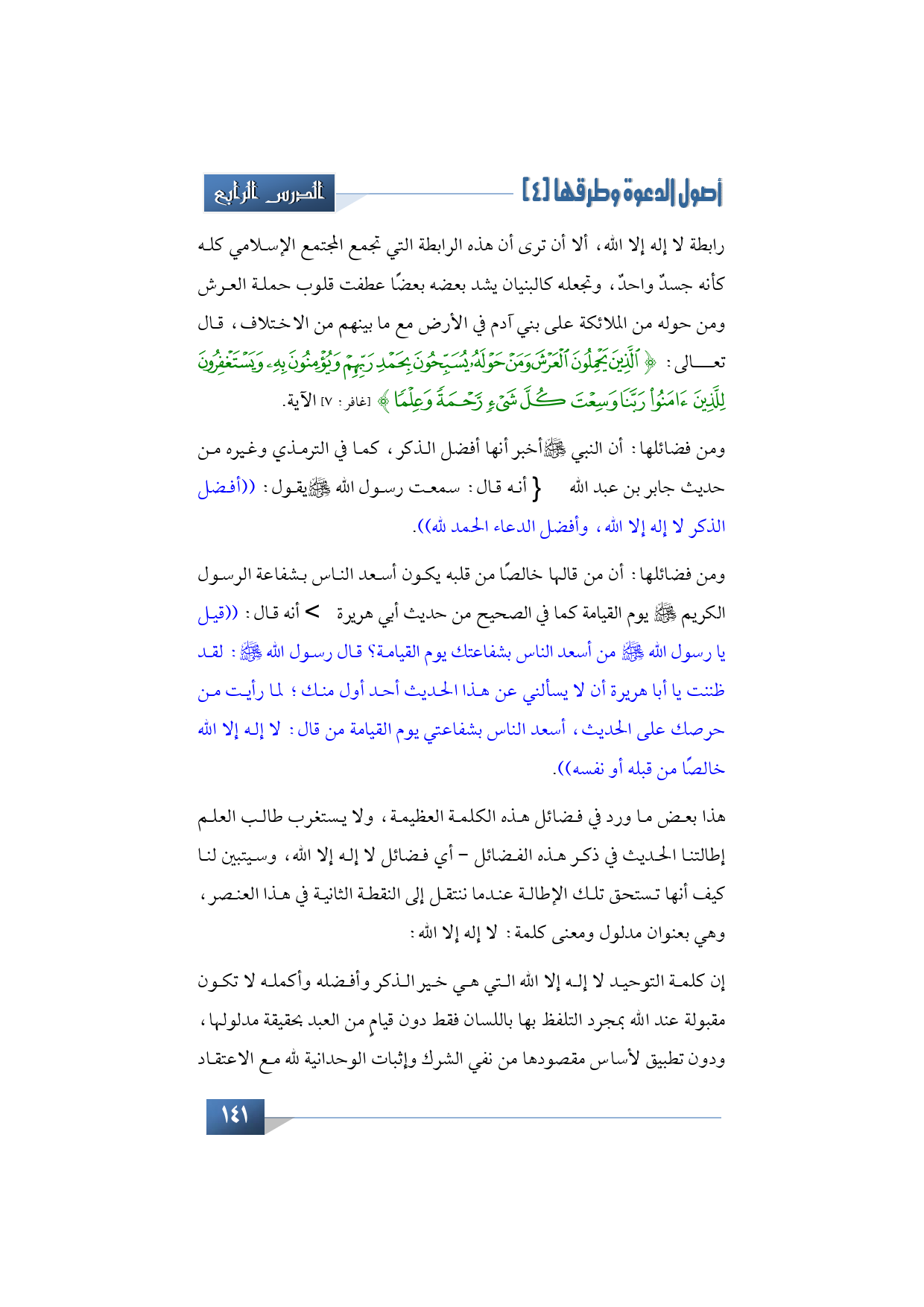 رابطة لا إله إلا الله، ألا أن ترى أن هذه الرابطة التي تجمع المجتمع الإسلامي كله كأنه جسدٌ واحدٌ، وتجعله كالبنيان يشد بعضه بعضًا عطفت قلوب حملة العرش ومن حوله من الملائكة على بني آدم في الأرض مع ما بينهم من الاختلاف، قال تعالى: {الَّذِينَ يَحْمِلُونَ الْعَرْشَ وَمَنْ حَوْلَهُ يُسَبِّحُونَ بِحَمْدِ رَبِّهِمْ وَيُؤْمِنُونَ بِهِ وَيَسْتَغْفِرُونَ لِلَّذِينَ آمَنُوا رَبَّنَا وَسِعْتَ كُلَّ شَيْءٍ رَحْمَةً وَعِلْمًا ... } (غافر: من الآية: 7) إلى آخر ما جاء في هذه الآية الكريمة.