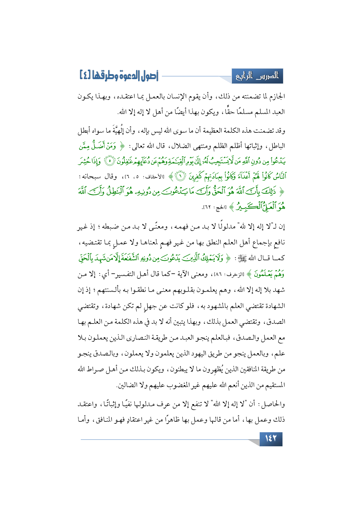 إن للا إله إلا لله مدلولًا لا بد من فهمه، ومعنًى لا بد من ضبطه؛ إذ غير نافعٍ بإجماع أهل العلم النطق بها من غير فهمٍ لمعناها ولا عملٍ بما تقتضيه، كما قال الله -سبحانه وتعالى-: {وَلا يَمْلِكُ الَّذِينَ يَدْعُونَ مِنْ دُونِهِ الشَّفَاعَةَ إِلاَّ مَنْ شَهِدَ بِالْحَقِّ وَهُمْ يَعْلَمُونَ} (الزخرف: 86) ومعنى الآية -كما قال أهل التفسير- أي: إلا من شهد بلا إله إلا الله، وهم يعلمون بقلوبهم معنى ما نطقوا به بألسنتهم؛ إذ أن الشهادة تقتضي العلم بالمشهود به، فلو كانت عن جهلٍ لم تكن شهادة، وتقتضي الصدق، وتقتضي العمل بذلك، وبهذا يتبين أنه لا بد في هذه الكلمة من العلم بها مع العمل والصدق، فبالعلم ينجو العبد من طريقة النصارى الذين يعملون بلا علم، وبالعمل ينجو من طريق اليهود الذين يعلمون ولا يعملون، وبالصدق ينجو من طريقة المنافقين الذين يُظهِرون ما لا يبطنون، ويكون بذلك من أهل صراط الله المستقيم من الذين أنعم الله عليهم غير المغضوب عليهم ولا الضالين.
