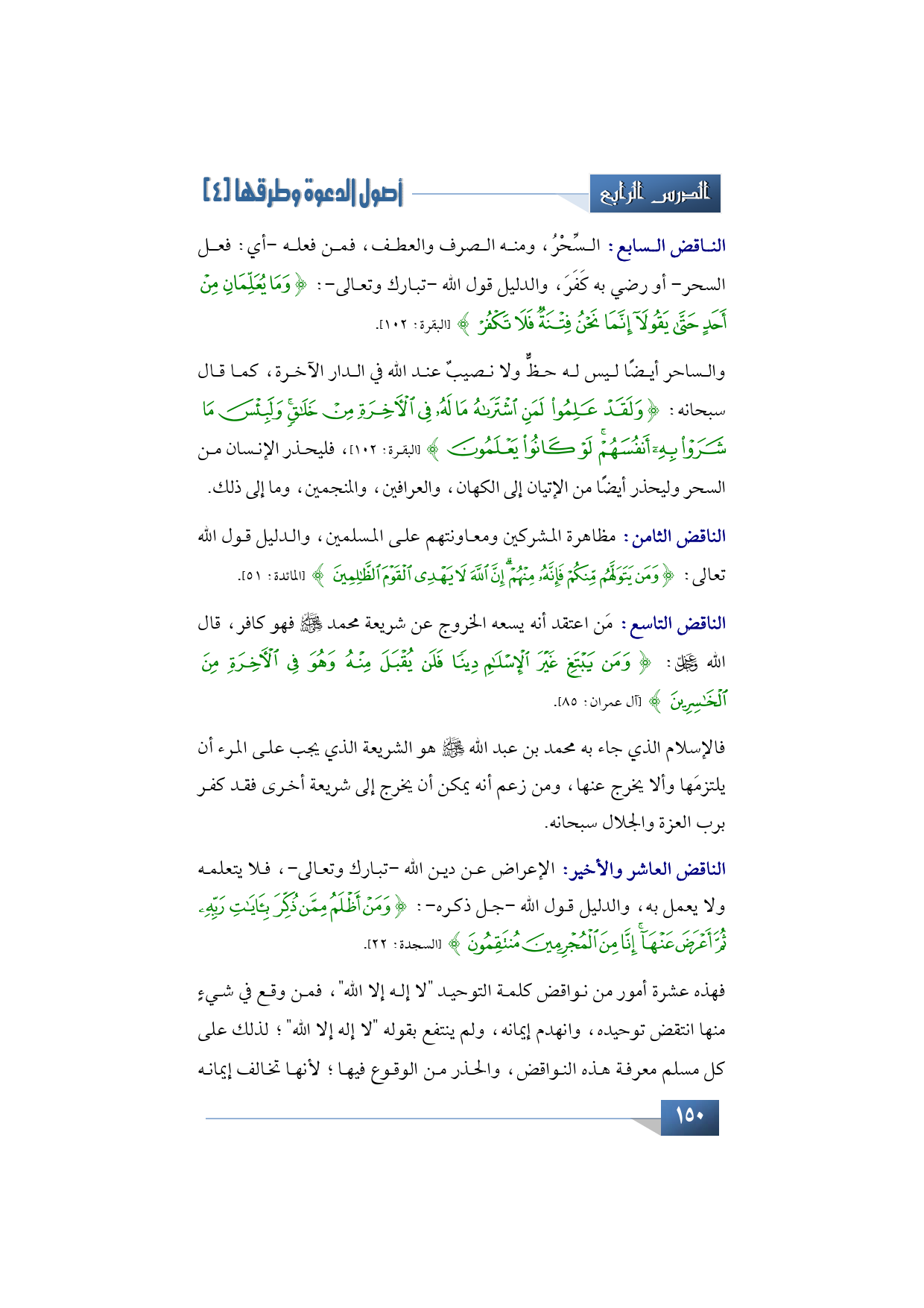 الناقض العاشر والأخير: الإعراض عن دين الله -تبارك وتعالى- لا يتعلمه ولا يعمل به، والدليل قول الله -جل ذكره-: {وَمَنْ أَظْلَمُ مِمَّنْ ذُكِّرَ بِآيَاتِ رَبِّهِ ثُمَّ أَعْرَضَ عَنْهَا إِنَّا مِنَ الْمُجْرِمِينَ مُنتَقِمُونَ} (السجدة: 22).