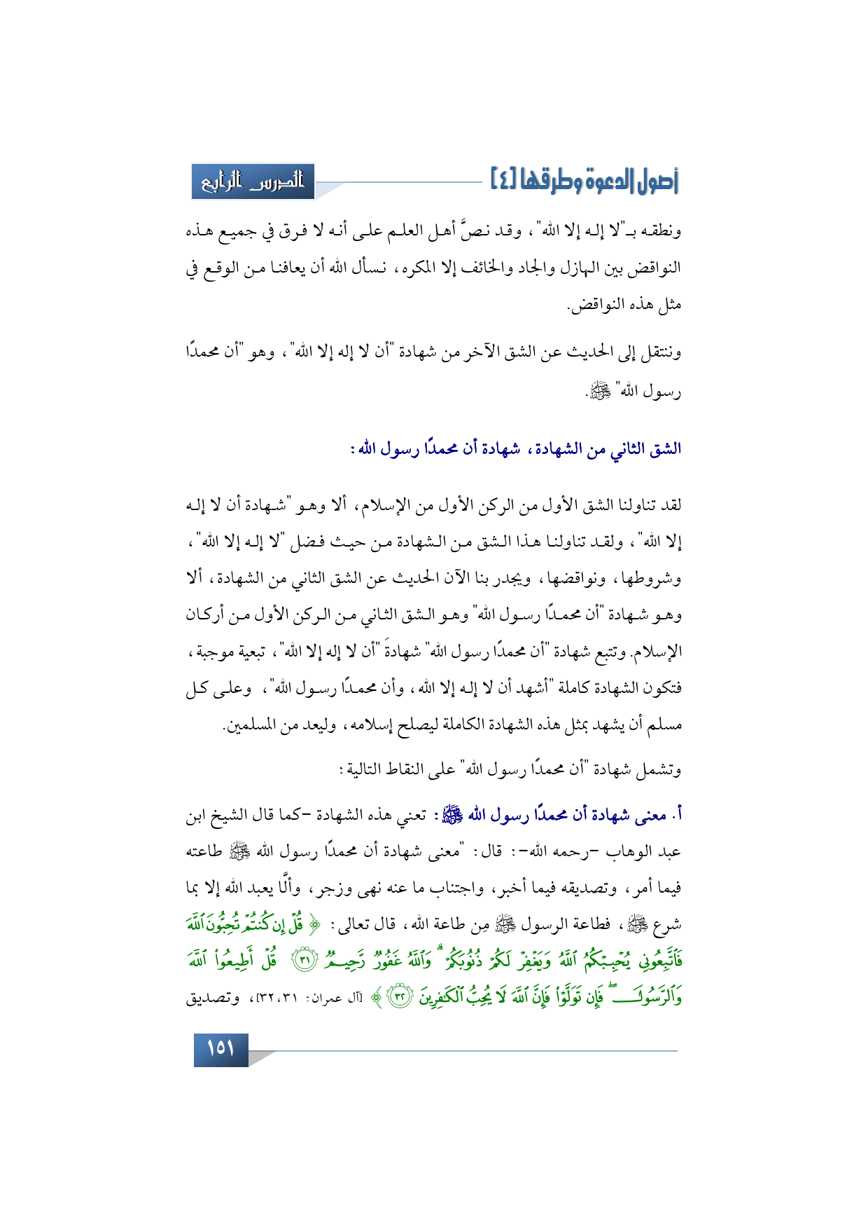 أ- معنى شهادة أن محمدًا رسول الله -صلى الله عليه وآله وسلم- معنى هذه الشهادة -كما قال شيخ الإسلام الشيخ ابن عبد الوهاب رحمه الله -تبارك وتعالى-: قال: معنى شهادة أن محمدًا رسول الله -صلى الله عليه وآله وسلم- طاعته فيما أمر، وتصديقه فيما أخبر، واجتناب ما عنه نهى وزجر، وألَّا يعبد الله إلا بما شرع -صلى الله عليه وآله وسلم- فطاعة الرسول -صلى الله عليه وآله وسلم- من طاعة الله، قال تعالى: {قُلْ إِنْ كُنْتُمْ تُحِبُّونَ اللَّهَ فَاتَّبِعُونِي يُحْبِبْكُمُ اللَّهُ وَيَغْفِرْ لَكُمْ ذُنُوبَكُمْ} (آل عمران: من الآية: 31) وقال سبحانه: {قُلْ أَطِيعُوا اللَّهَ وَالرَّسُولَ} (آل عمران: من الآية: 32) وتصديق
