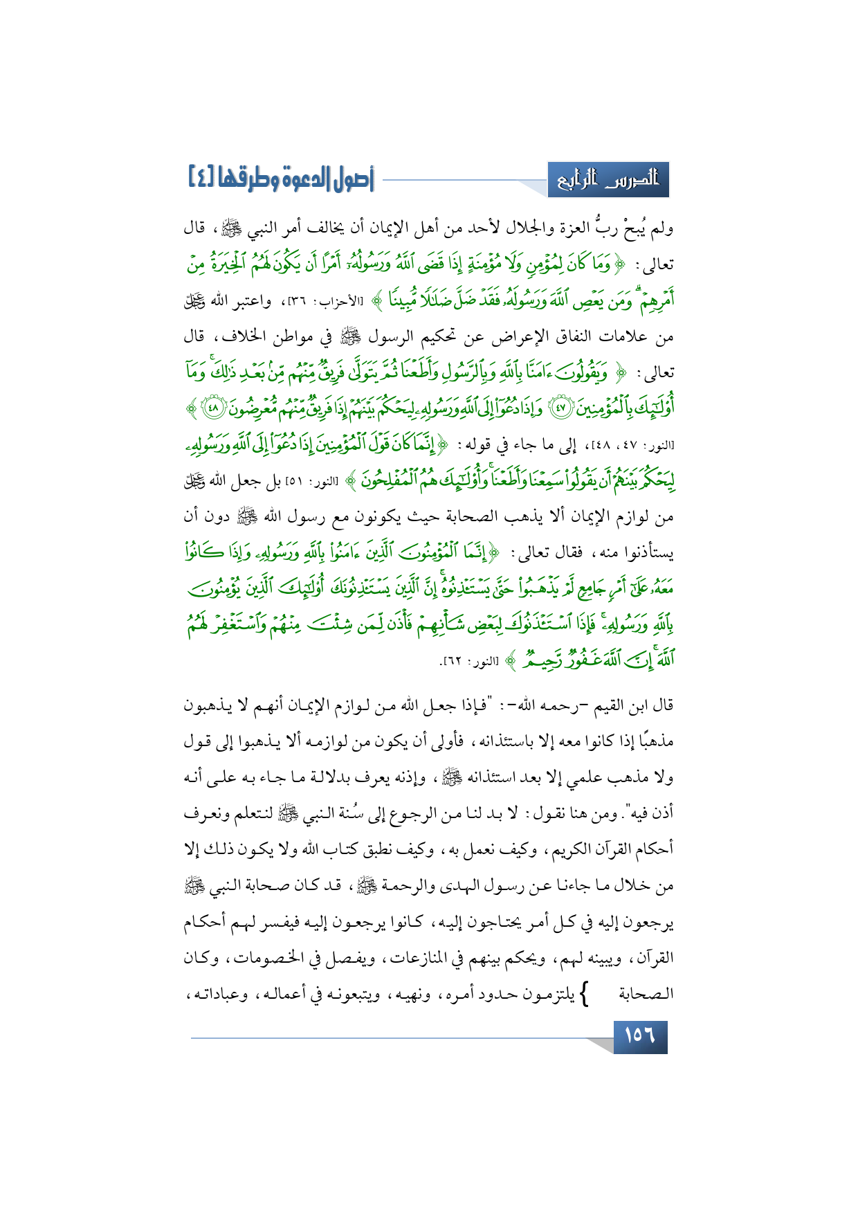 قال ابن القيم -رحمه الله-: فإذا جعل الله من لوازم الإيمان أنهم لا يذهبون مذهبًا إذا كانوا مع إلا باستئذانه، فأولى أن يكون من لوازمه ألا يذهبوا إلى قول ولا مذهب علمي إلا بعد استئذانه -صلى الله عليه وآله وسلم- وإذنه يعرف بدلالة ما جاء به على أنه أذن فيه. ومن هنا أقول: لا بد لنا من الرجوع إلى سنة النبي -صلى الله عليه وآله وسلم- لنتعلم ونعرف أحكام القرآن الكريم، وكيف نعمل به، وكيف نطبق كتاب الله -تبارك وتعالى- ولا يكون ذلك إلا من خلال ما جاءنا عن رسول الهدى والرحمة -صلى الله عليه وآله وسلم- قد كان صحابة النبي -عليه الصلاة والسلام- يرجعون إليه في كل أمر يحتاجون إليه، كانوا يرجعون إليه فيفسر لهم أحكام القرآن، ويبين لهم مشكلات القرآن، ويحكم بينهم في المنازعات، ويفصل في الخصومات، وكان الصحابة -رضوان الله عليهم- يلتزمون حدود أمره، ونهيه، ويتبعونه في أعماله، وعباداته،