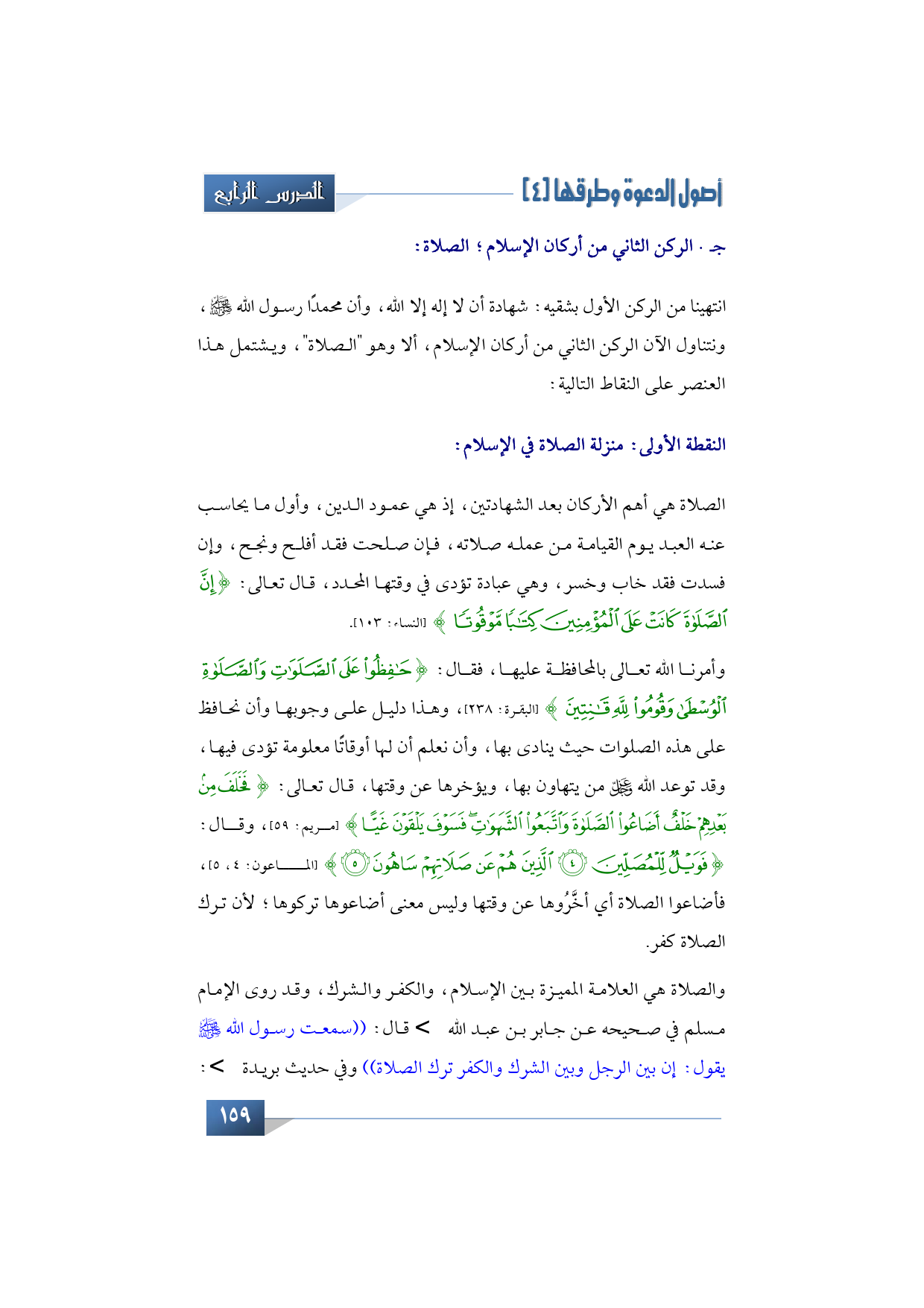 ويشتمل هذا العنصر على النقاط التالية: النقطة الأولى: منزلة الصلاة في الإسلام، الصلاة هي أهم وآكد الأركان بعد الشهادتين، إذ هي عمود الدين، وأول ما يحاسب عنه العبد يوم القيامة من عمله صلاته، فإن صلحت فقد أفلح وأنجح، وإن فسدت فقد خاب وخسر، وهي عبادة تؤدى في وقتها المحدد، قال تعالى: {إِنَّ الصَّلاةَ كَانَتْ عَلَى الْمُؤْمِنِينَ كِتَابًا مَوْقُوتًا} (النساء: من الآية: 103).