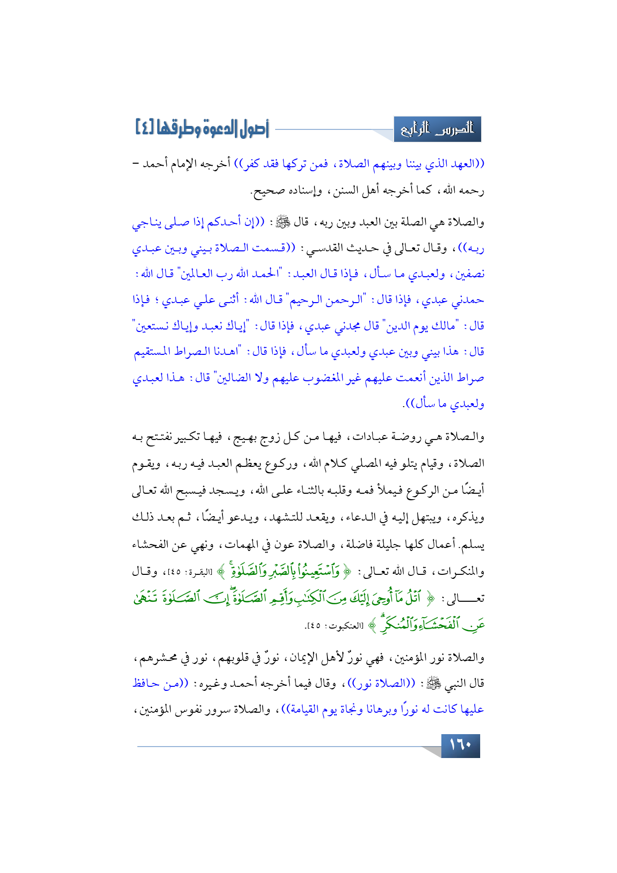 الصلاة -أيها الإخوة الكرام- صلة بين العبد وبين ربه، قال -صلى الله عليه وآله وسلم-: ((إن أحدكم إذا صلى يناجي ربه)) وقال تعالى في الحديث القدسي: ((قسمت الصلاة بيني وبين عبدي نصفين، ولعبدي ما سأل، فإذا قال العبد: الحمد لله رب العالمين، قال تعالى: حمدني عبدي، وإذا قال: الرحمن الرحيم، قال: أثنى علي عبدي، وإذا قال: مالك يوم الدين، قال: مجدني عبدي، فإذا قال: إياك نعبد وإياك نستعين، قال: هذا بيني وبين عبدي ولعبدي ما سأل)) تأملوا هذا الفضل العظيم، وهو يبين مكانة، وأهمية الصلاة، إذا قال العبد: إياك نعبد وإياك نستعين، قال الله له: ((هذا بيني وبين عبدي ولعبدي ما سأل)) يعني اطلب ما شئت، فإذا قال: اهدنا الصراط المستقيم صراط الذين أنعمت عليهم غير المغضوب عليهم ولا الضالين. قال: ((هذا لعبدي ولعبدي ما سأل)).