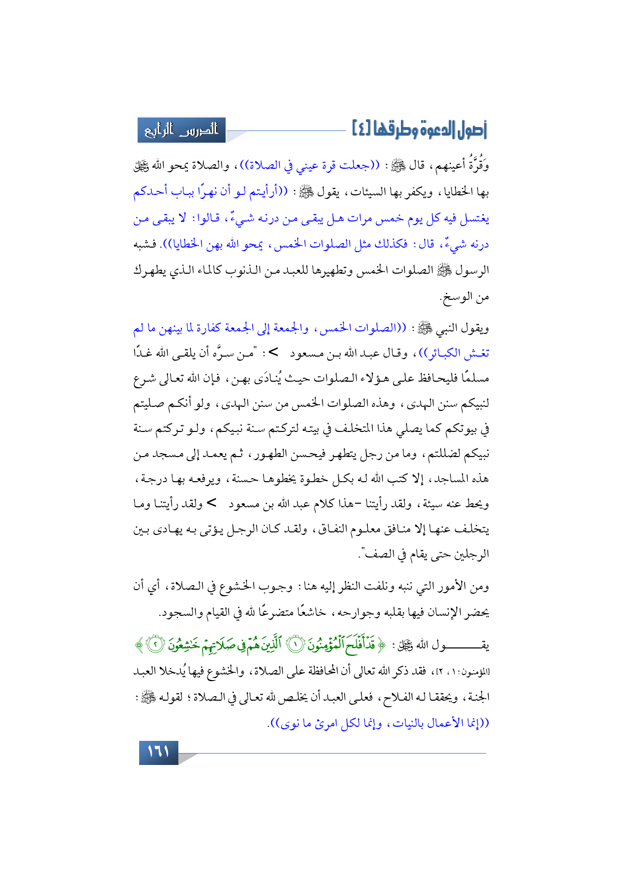 قول الله -تبارك وتعالى-: {قَدْ أَفْلَحَ الْمُؤْمِنُونَ الَّذِينَ هُمْ فِي صَلاتِهِمْ خَاشِعُونَ} (المؤمنون: 1، 2) فالله -عز وجل- ذكر أن المحافظة على الصلاة، وأن الخشوع فيها يدخل العبد الجنة، ويحقق له الفلاح، الذين هم في صلاتهم خاشعون كما على العبد أيضًا أن يخلص لله -تبارك وتعالى- في الصلاة لقوله -صلى الله عليه وآله وسلم-: ((إنما الأعمال بالنيات، وإنما لكل امرئ ما نوى)).