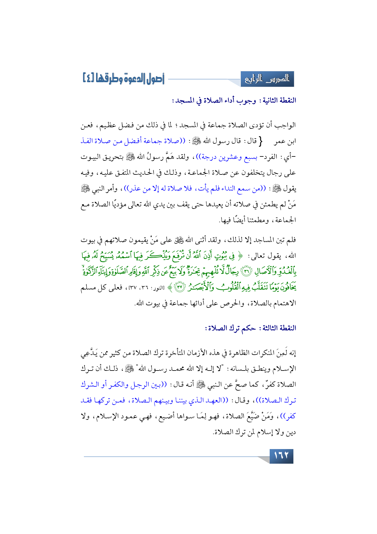 وهذه مسألة مهمة يجب أن ألفت النظر إليها الصلاة مهمة، وأيضًا شهود هذه الصلاة، وحضورها في بيوت الله -تبارك وتعالى- لأن مساجد الله -عز وجل- لم تبن إلا لذلك، والله أثنى على رجال يقومون لله -تبارك وتعالى- في بيوتهم: {فِي بُيُوتٍ أَذِنَ اللَّهُ أَنْ تُرْفَعَ وَيُذْكَرَ فِيهَا اسْمُهُ يُسَبِّحُ لَهُ فِيهَا بِالْغُدُوِّ وَالآصَالِ رِجَالٌ لا تُلْهِيهِمْ تِجَارَةٌ وَلا بَيْعٌ عَنْ ذِكْرِ اللَّهِ} (النور: 36، 37) فعلى المسلمين جميعًا أن يهتموا بهذه الصلاة، وأن يحرصوا على أدائها جماعة في بيوت الله -تبارك وتعالى.