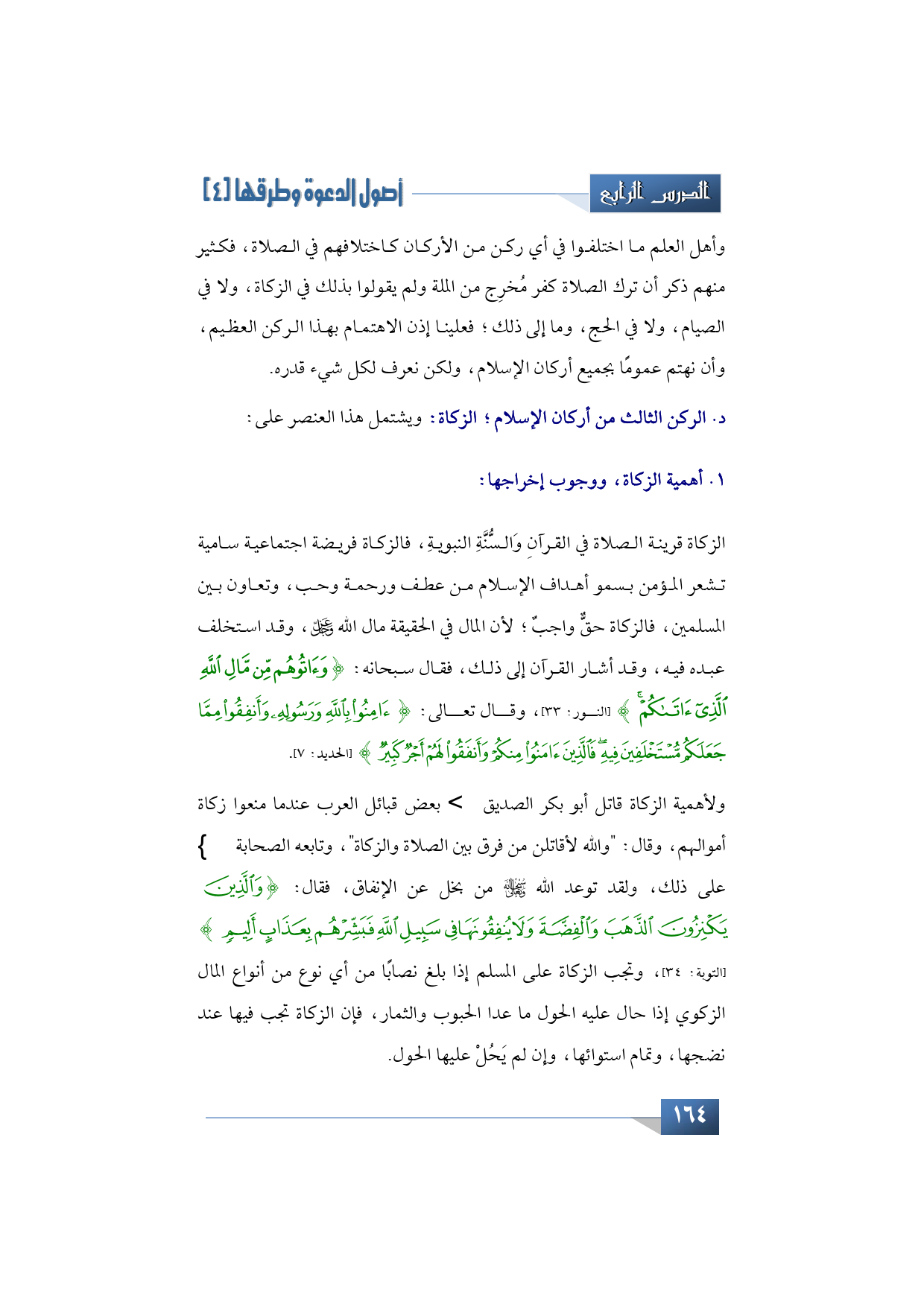 ولأهمية الزكاة قاتل أبو بكر الصديق -رضي الله تعالى عنه- بعض قبائل العرب عندما منعوا زكاة أموالهم، وقال: والله لأقاتلن من فرق بين الصلاة والزكاة، وتابعه الصحابة -رضي الله تعالى عنهم- على ذلك، ولقد توعد الله -سبحانه وتعالى- من بخل عن الإنفاق، فقال: {وَالَّذِينَ يَكْنِزُونَ الذَّهَبَ وَالْفِضَّةَ وَلا يُنفِقُونَهَا فِي سَبِيلِ اللَّهِ فَبَشِّرْهُمْ بِعَذَابٍ أَلِيمٍ} (التوبة: من الآية: 34) وتجب الزكاة على المسلم إذا بلغ نصابًا من أي نوع من أنواع المال الزكوي إذا حال عليه الحول ما عدا الحبوب والثمار، فإن الزكاة تجب فيها عند نضجها، وتمام استوائها، وإن لم يحل عليها الحول.
