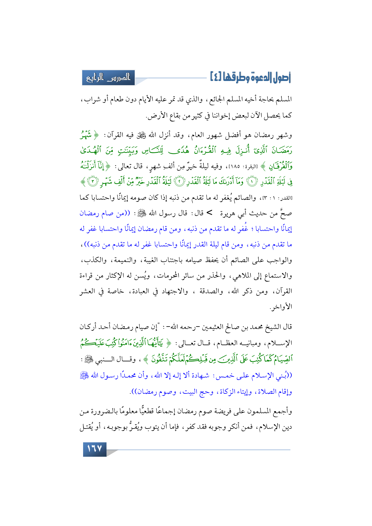 قال الشيخ محمد بن صالح العثيمين -رحمه الله تبارك وتعالى-: إن صيام رمضان أحد أركان الإسلام، ومبانيه العظام، قال تعالى: {يَا أَيُّهَا الَّذِينَ آمَنُوا كُتِبَ عَلَيْكُمُ الصِّيَامُ كَمَا كُتِبَ عَلَى الَّذِينَ مِنْ قَبْلِكُمْ لَعَلَّكُمْ تَتَّقُونَ} وقال النبي -صلى الله عليه وآله وسلم- بني الإسلام على خمس: ((شهادة ألا إله إلا الله، وأن محمدًا رسول الله -صلى الله عليه وآله وسلم- وإقام الصلاة، وإيتاء الزكاة، وحج البيت، وصوم رمضان)).