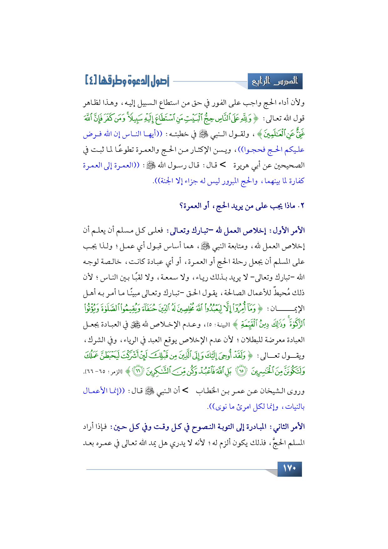 أول أمر مما يجب على من يريد الحج، أو العمرة أن يخلص العمل لله -تبارك وتعالى- يجب على المسلم أن يعلم أن إخلاص العمل لله، ومتابعة النبي -صلى الله عليه وآله وسلم- هما أساس قبول أي عمل، ولذا يجب عليه أن يجعل العبد رحلة الحج، أو العمرة، أو عبادة -كما ذكرت- خالصة لوجه الله -تبارك وتعالى- لا يريد بذلك رياء، ولا سمعة، ولا لقبًا بين الناس؛ لأن ذلك محبط للأعمال الصالحة، يقول الحق -تبارك وتعالى مبينًا ما أمر به أهل الإيمان-: {وَمَا أُمِرُوا إِلاَّ لِيَعْبُدُوا اللَّهَ مُخْلِصِينَ لَهُ الدِّينَ حُنَفَاءَ وَيُقِيمُوا الصَّلاةَ وَيُؤْتُوا الزَّكَاةَ وَذَلِكَ دِينُ الْقَيِّمَةِ} (البينة: 5) وعدم الإخلاص لله -عز وجل- في العبادة يجعل العبادة معرضة للبطلان، والعياذ بالله -تبارك وتعالى- لأن عدم الإخلاص يوقع العبد في الرياء، وفي الشرك، والله -تبارك وتعالى- يقول: {وَلَقَدْ أُوحِيَ إِلَيْكَ وَإِلَى الَّذِينَ مِنْ قَبْلِكَ لَئِنْ أَشْرَكْتَ لَيَحْبَطَنَّ عَمَلُكَ وَلَتَكُونَنَّ مِنَ الْخَاسِرِينَ بَلِ اللَّهَ فَاعْبُدْ وَكُنْ مِنَ الشَّاكِرِينَ} (الزمر: 65 - 66).