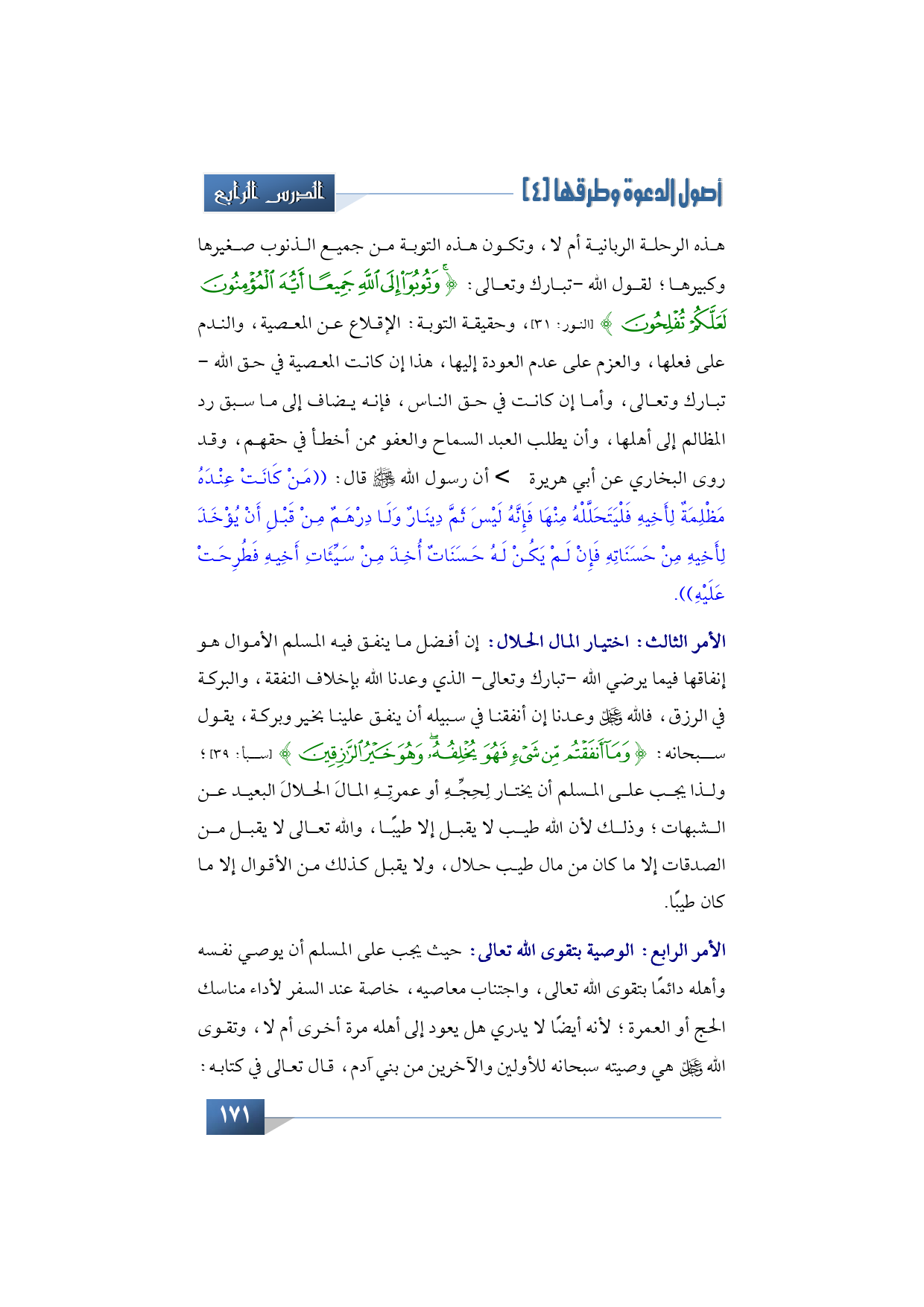 هذه الرحلة الربانية، أو لا وينتهي أجله، الله أعلم، وهذه التوبة تكون من جميع الذنوب صغيرها، وكبيرها لقول الله -تبارك وتعالى-: {وَتُوبُوا إِلَى اللَّهِ جَمِيعًا أَيُّهَا الْمُؤْمِنُونَ لَعَلَّكُمْ تُفْلِحُونَ} (النور: من الآية: 31) وحقيقة التوبة: الإقلاع عن المعصية، والندم على فعلها، والعزم على عدم العودة إليها، هذا إن كانت المعصية في حق الله -تبارك وتعالى- وأما إن كانت في حق الناس، فإنه يضاف إلى ما سبق رد المظالم إلى أهلها، وأن يطلب العبد السماح والعفو ممن أخطأ في حقهم بأهمية ذلك؛ حيث قد روى البخاري عن أبي هريرة -رضي الله تعالى عنه- أن رسول الله -صلى الله عليه وآله وسلم- قال: ((من كانت عنده مظلمة لأخيه فليتحلل منها، فإنه ليس ثَمّ دينار، ولا درهم من قبل أن يؤخذ لأخيه من حسناته، فإن لم يكن له حسنات أخذ من سيئات أخيه فطرحت عليه)).