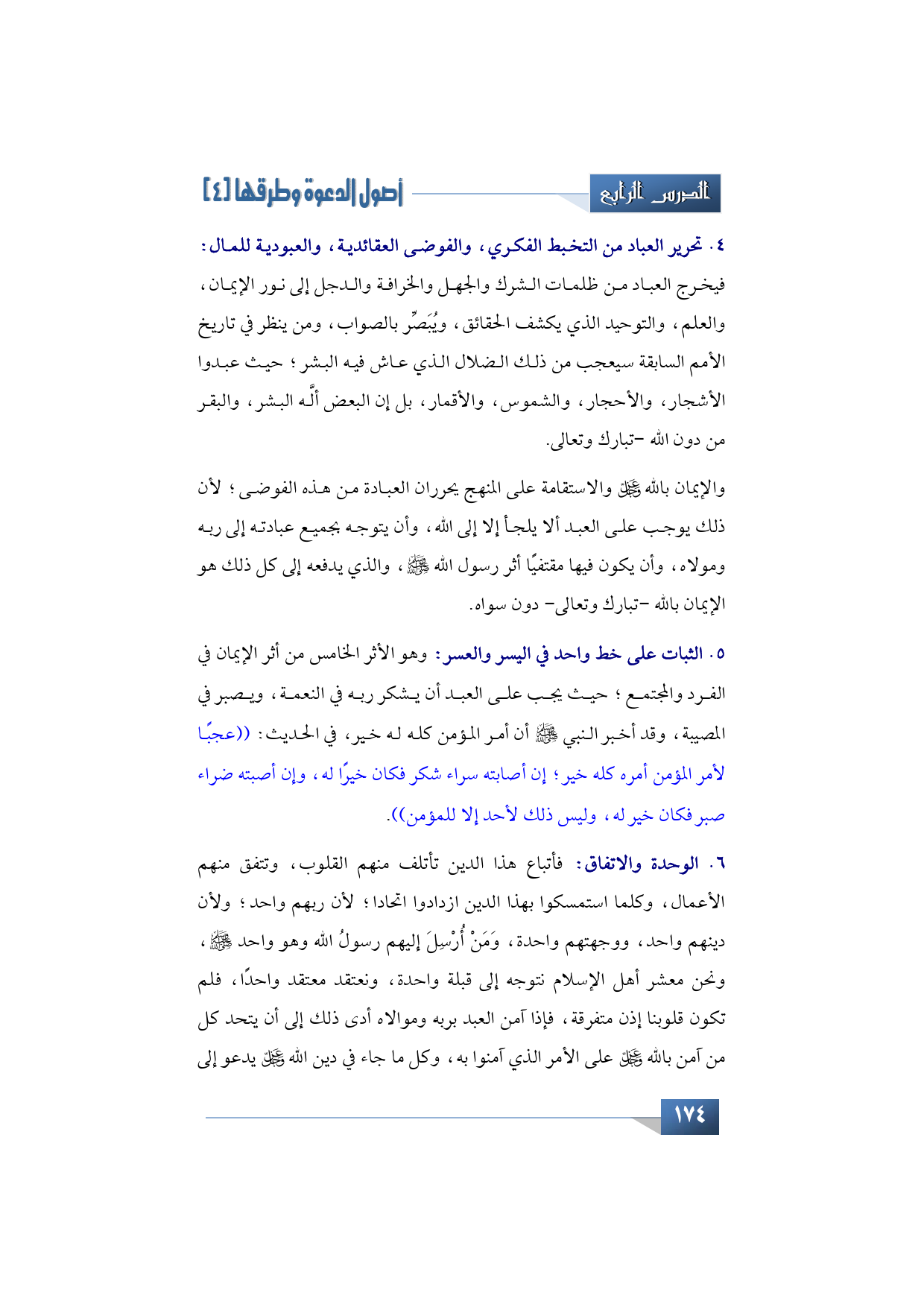 الأمر الرابع من أثر الإيمان في الفرد والمجتمع: تحرير العباد من التخبط الفكري، والفوضى العقائدية، والعبودية للمال، وإخراجهم من ظلمات الشرك والجهل والخرافة والدجل إلى نور الإيمان، والعلم، والتوحيد الذي يكشف الحقائق، ويبَصِّر بالصواب، ومن يدور في تاريخ الأمم يعجب من ذلك الضلال الذي عاش فيه البشر حيث عبدوا الأشجار، والأحجار، والشموس، والأقمار، بل إن البعض ألَّه البشر، والبقر من دون الله -تبارك وتعالى.