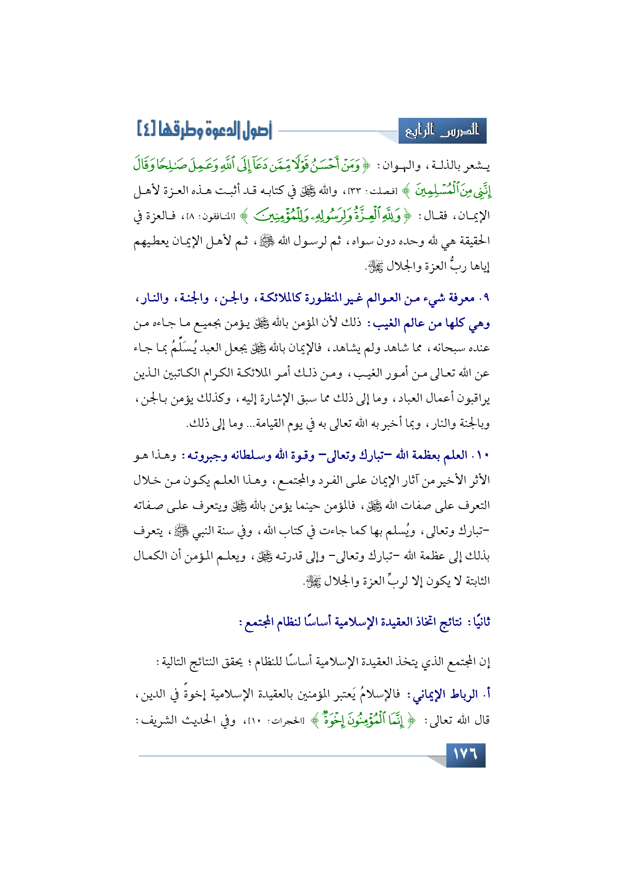 يشعر بالضعة، والذلة، والهوان: {وَمَنْ أَحْسَنُ قَوْلًا مِمَّنْ دَعَا إِلَى اللَّهِ وَعَمِلَ صَالِحًا وَقَالَ إِنَّنِي مِنَ الْمُسْلِمِينَ} (فصلت: 33) والله -عز وجل- في كتابه قد أثبت هذه العزة لأهل الإيمان، فقال: {وَلِلَّهِ الْعِزَّةُ وَلِرَسُولِهِ وَلِلْمُؤْمِنِينَ} (المنافقون: من الآية: 8)، فالعزة في الحقيقة هي لله وحده دون سواه، ثم لرسول الله -صلى الله عليه وسلم- ثم لأهل الإيمان يعطيهم إياها رب العزة والجلال -سبحانه وتعالى.