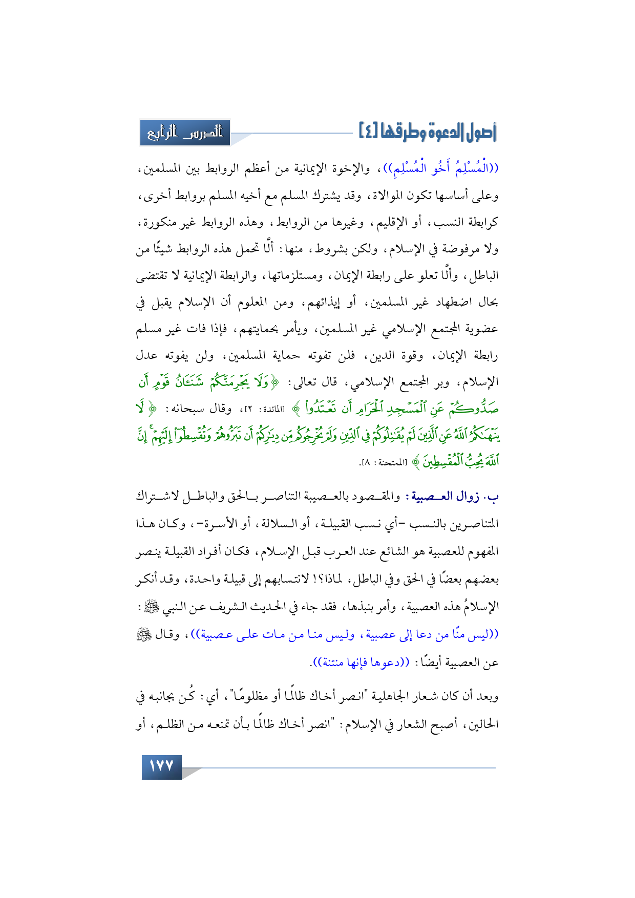 الأمر الثاني من نتائج اتخاذ العقيدة الإسلامية أساسًا لنظام المجتمع: زوال العصبية، والمقصود بالعصيبة التناصر بالحق والباطل لاشتراك المتناصرين بالنسب -أي نسب القبيلة، أو السلالة، أو الأسرة- وكان هذا المفهوم للعصبية هو الشائع عند العرب قبل الإسلام، فكان أفراد القبيلة ينصر بعضهم بعضًا في الحق وفي الباطل، لماذا؟ لانتسابهم إلى قبيلة واحدة، وقد أنكر الإسلام هذه العصبية، وأمر بنبذها فقد جاء في الحديث الشريف عن النبي -صلى الله عليه وآله وسلم-: ((ليس منًا من دعا إلى عصبية وليس منا من مات على عصبية)) وقال -عليه الصلاة والسلام- عن العصبية: ((دعوها فإنها منتنة)).
