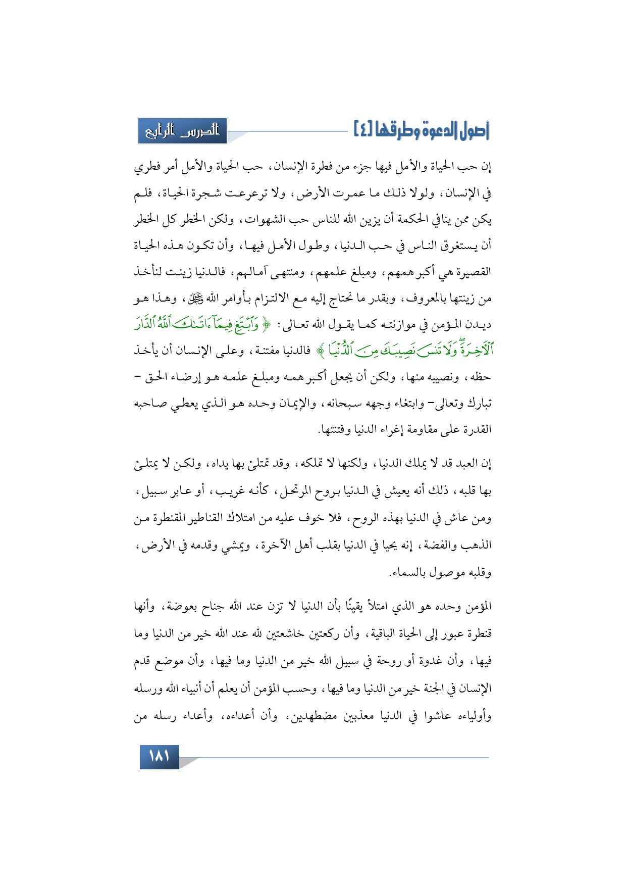 إن حب الحياة والأمل فيها جزء من فطرة الإنسان، حب الحياة والأمل أمر فطري في الإنسان، ولولا ذلك ما عمرت الأرض، ولا ترعرعت شجرة الحياة فلم يكن ممن ينافي الحكمة أن يزين الله للناس حب الشهوات، ولكن الخطر كل الخطر أن يستغرق الناس في حب الدنيا، وطول الأمل فيها، وأن تكون هذه الحياة القصيرة هي أكبر همهم، ومبلغ علمهم، ومنتهى آمالهم، فالدنيا زينت لك، خذ من زينتها بالمعروف، وبقدر ما تحتاج إليه مع الالتزام بأوامر رب العزة والجلال سبحانه وتعالى، وهذا هو ديدن المؤمن في موازنته كما قال الله فيما سبق أن ذكرته: {وَابْتَغِ فِيمَا آتَاكَ اللَّهُ الدَّارَ الآخِرَةَ وَلا تَنسَ نَصِيبَكَ مِنَ الدُّنْيَا} فالدنيا مفتنة، وعلى الإنسان أن يأخذ حظه، ونصيبه منها، ولكن أن يجعل أكبر همه، وأن يجعل مبلغ علمه: هو إرضاء الحق -تبارك وتعالى- وابتغاء وجه الله سبحانه، والإيمان وحده هو الذي يعطي صاحبه القدرة على مقاومة إغراء الدنيا وفتنتها.
