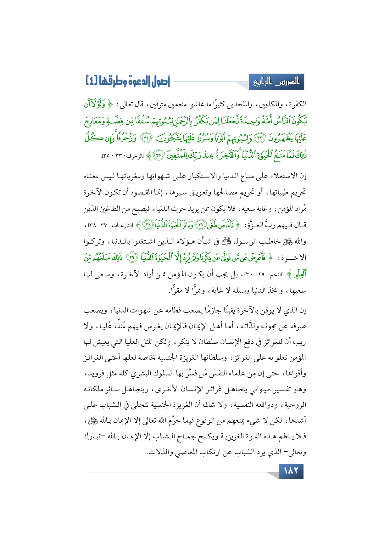 إن الذي لا يوقن بالآخرة يقينًا جازمًا يصعب فطامه عن شهوات الدنيا، ويصعب صرفه عن مجونه، ولذاته، أما أهل الإيمان فالإيمان يغرس فيهم مثلًا عليًا هو ما أشير إليها الآن، ولا ريب أن للغرائز في دفع الإنسان سلطان لا ينكر، ولكن المثل العليا التي يعيش لها المؤمن تعلو به على الغرائز، وسلطانها الغريزة الجنسية بخاصة لعلها أعتى الغرائز وأقواها، حتى إن في علماء النفس من فسر بها السلوك البشري كله مثل فرويد، وهو تفسير حيواني يتجاهل غرائز الإنسان الأخرى، ويتجاهل سائر ملكاته الروحية، ودوافعه النفسية، وأننا لا أنافشه هنا الآن، ولكني لا أشك في أن الغريزة الجنسية تتجلى في الشباب على أشدها، ولا شيء يمنع الشباب من الوقوع فيما حرم الله تعالى إلا الإيمان بالله -عز وجل- إن هذه القوة الغريزية التي هي في الشباب لا ينظمها، ولا يحل لدى الإنسان ما فيها من رغبة في إتيان المنكر إلا بالإيمان بالله -تبارك وتعالى.