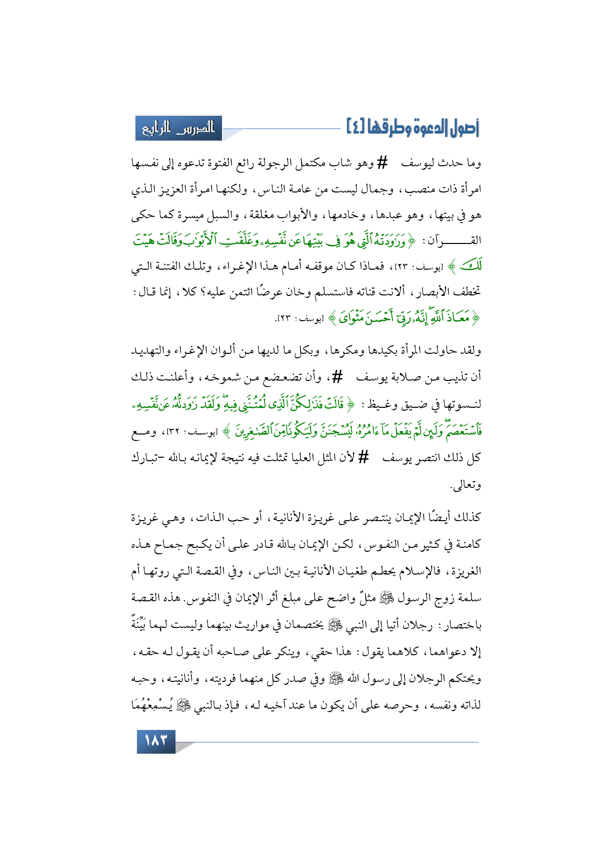 ما حدث ليوسف عليه السلام شاب في ريعان الشباب شاب مكتمل الرجولة رائع الفتوة تدعوه إلى نفسها امرأة ذات منصب، وجمال ليست من عامة الناس، ولكنها امرأة العزيز الذي هو في بيتها، وهو عبدها، وخادمها، والأبواب مغلقة، والسبل ميسرة كما حكى القرآن: {وَرَاوَدَتْهُ الَّتِي هُوَ فِي بَيْتِهَا عَنْ نَفْسِهِ وَغَلَّقَتِ الأَبْوَابَ وَقَالَتْ هَيْتَ لَكَ} (يوسف: من الآية: 23) فماذا كان موقفه أمام هذا الإغراء، وتلك الفتنة التي تخطف الأبصار، ألانت قناته فاستسلم وخان عرضًا ائتمن عليه؟ كلا، إنما قال: {مَعَاذَ اللَّهِ إِنَّهُ رَبِّي أَحْسَنَ مَثْوَايَ إِنَّهُ لا يُفْلِحُ الظَّالِمُونَ} (يوسف: من الآية: 23).