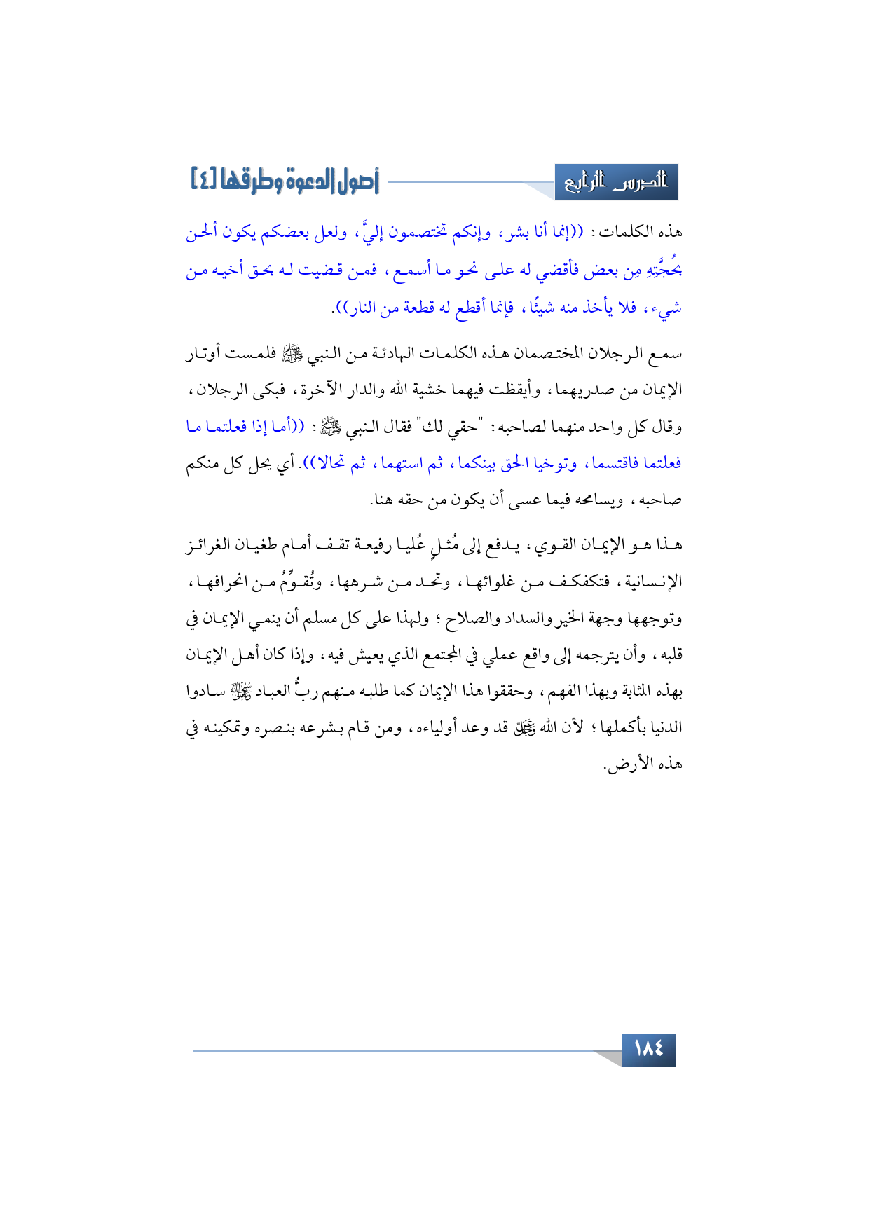 هذه الكلمات: ((إنما أنا بشر، وإنكم تختصمون إلي، ولعل بعضكم يكون ألحن بحجته من بعض فأقضي له على نحو ما أسمع، فمن قضيت له بحق أخيه من شيء، فلا يأخذ منه شيئًا، فإنما أقطع له قطعة من النار)).