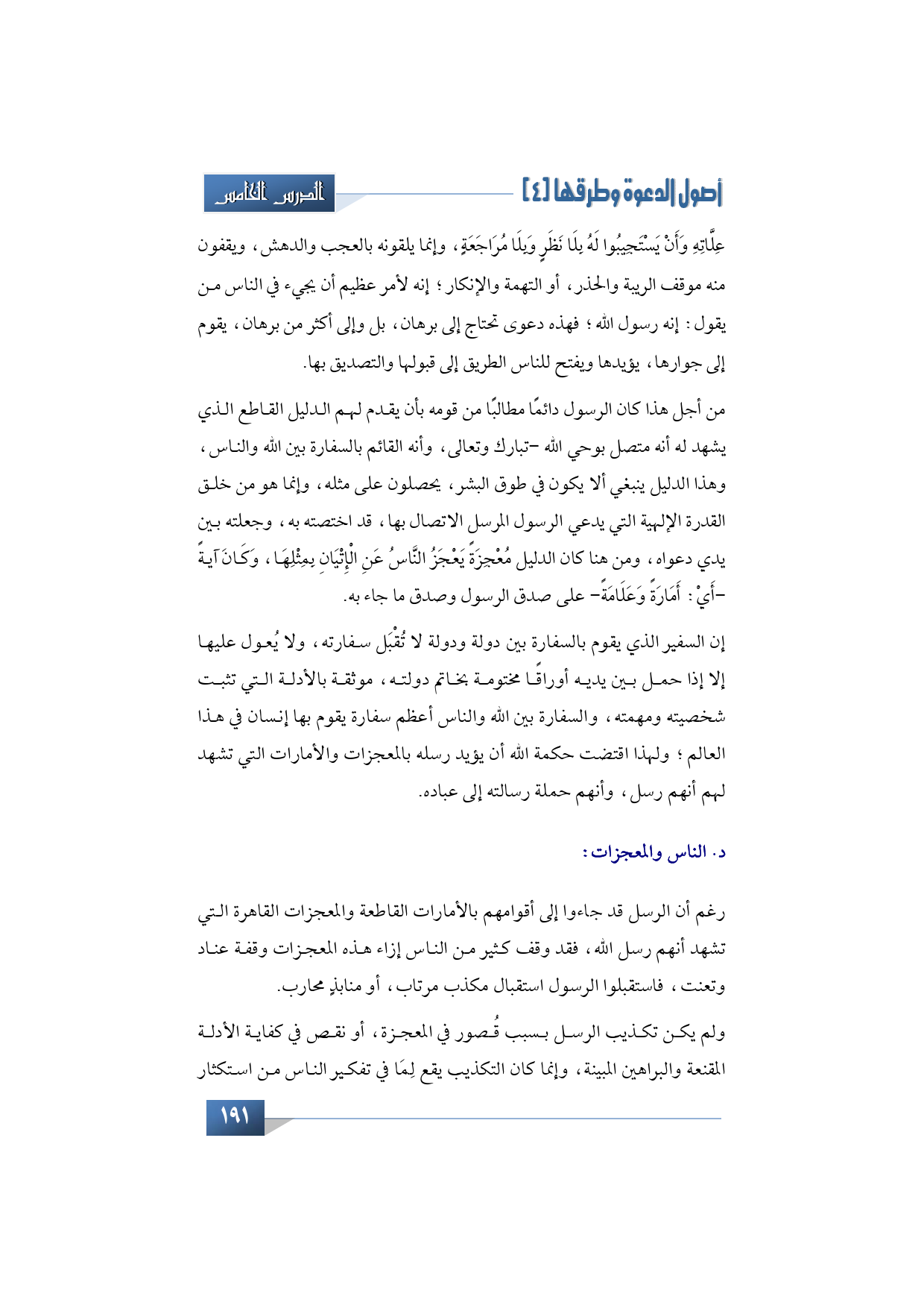 عِلَّاتِهِ وَأَنْ يَسْتَجِيبُوا لَهُ بِلَا نَظَرٍ وَبِلَا مُرَاجَعَةٍ، وإنما يلقونه بالعجب والدهش، ويقفون منه موقف الريبة والحذر، أو التهمة والإنكار؛ إنه لأمر عظيم أن يجيء في الناس من يقول: إنه رسول الله؛ إنها دعوى عجيبة تحتاج إلى برهان، بل وإلى أكثر من برهان، يقوم إلى جوارها، يؤيدها ويفتح للناس الطريق إلى قبولها والتصديق بها.