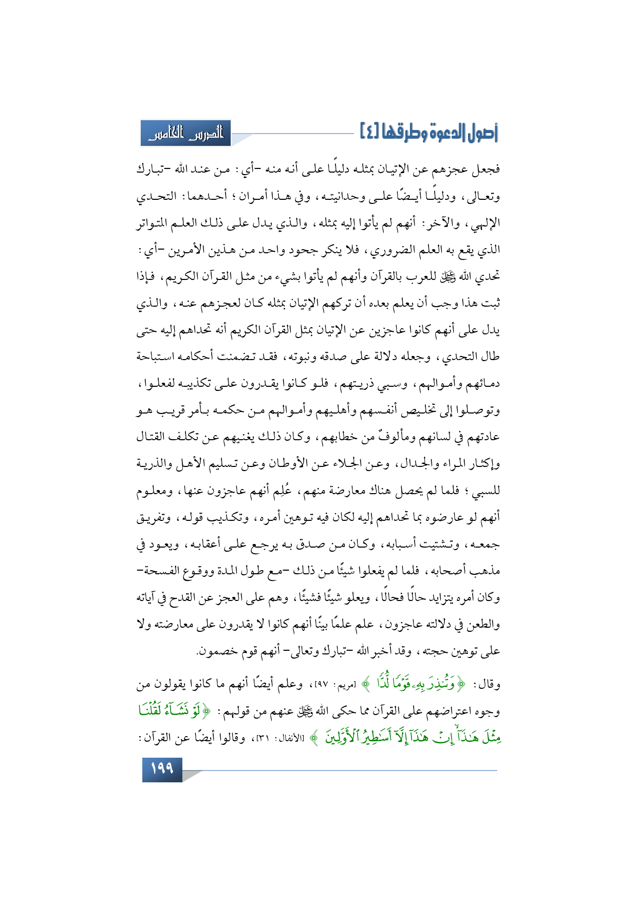 فجعل عجزهم عن الإتيان بمثله دليلًا على أنه منه -أعني: من عند الله -تبارك وتعالى- ودليلًا أيضًا على وحدانيته، وفي هذا أمران؛ أحدهما: التحدي الإلهي، والآخر: أنهم لم يأتوا إليه بمثله، والذي يدل على ذلك العلم المتواتر الذي يقع به العلم الضروري، فلا ينكر جحود واحد من هذين الأمرين -أعني: تحدي الله -عز وجل- للعرب بالقرآن وأنهم لم يأتوا بشيء من مثل القرآن الكريم- فإذا ثبت هذا وجب أن يعلم بعده أن تركهم الإتيان بمثله كان لعجزهم عنه، والذي يدل على أنهم كانوا عاجزين عن الإتيان بمثل القرآن الكريم أنه تحداهم إليه حتى طال التحدي، وجعله دلالة على صدقه ونبوته، فقد تضمنت أحكامه استباحة دمائهم وأموالهم، وسبي ذريتهم، فلو كانوا يقدرون على تكذيبه لفعلوا، وتوصلوا إلى تخليص أنفسهم وأهليهم وأموالهم من حكمه بأمر قريب هو عادتهم في لسانهم ومألوفٌ من خطابهم، وكان ذلك يغنيهم عن تكلف القتال وإكثار المراء والجدال، وعن الجلاء عن الأوطان وعن تسليم الأهل والذرية للسبي؛ فلما لم يحصل هناك معارضة منهم، عُلِم أنهم عاجزون عنها، ومعلوم أنهم لو عارضوه بما تحداهم إليه لكان فيه توهين أمره، وتكذيب قوله، وتفريق جمعه، وتشتيت أسبابه، وكان من صدق به يرجع على أعقابه، ويعود في مذهب أصحابه، فلما لم يفعلوا شيئًا من ذلك -مع طول المدة ووقوع الفسحة- وكان أمره يتزايد حالًا فحالًا، ويعلو شيئًا فشيئًا، وهم على العجز عن القدح في آياته والطعن في دلالته عاجزون، علم علمًا بينًا أنهم كانوا لا يقدرون على معارضته ولا على توهين حجته، وقد أخبر الله -تبارك وتعالى- أنهم قوم خصمون.