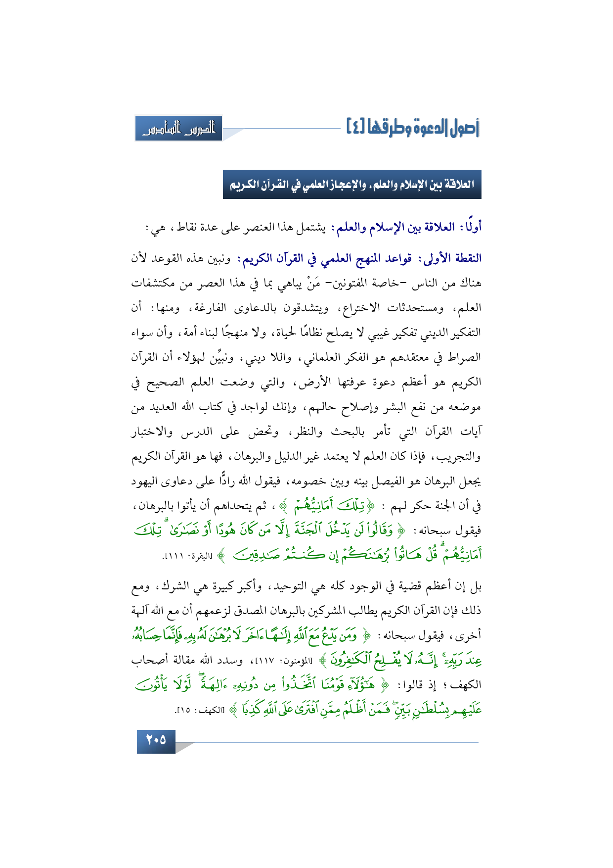 النقطة الأولى: قواعد المنهج العلمي في القرآن الكريم؛ وأقول هذا لأن بعض الناس -خاصة من المفتونين- يباهي بما في هذا العصر من مكتشفات العلم، ومستحدثات الاختراع، ويتشدقون بالدعاوي الفارغة، ومنها: أن التفكير الديني تفكير غيبي لا يصلح نظامًا لحياة، ولا منهجًا لبناء أمة، وأن سواء الصراط في معتقدهم هو الفكر العلماني، واللا ديني، وأنا أريد هنا أن أبين لهؤلاء أن القرآن الكريم هو أعظم دعوة عرفتها الأرض وضعت العلم الصحيح في موضعه من نفع البشر وإصلاح حالهم، وإنك لواجد في كتاب الله العديد من آيات القرآن التي تأمر بالبحث والنظر، وتحض على الدرس والاختبار والتجريب، فإذا كان العلم لا يعتمد غير الدليل والبرهان فها هو القرآن الكريم يجعل البرهان هو الفيصل بينه وبين خصومه، فيقول الله رادًّا على دعاوي اليهود في أن الجنة حكر لهم: {تِلْكَ أَمَانِيُّهُمْ} ثم يتحداهم أن يأتوا بالقرآن فيقول -سبحانه وتعالى-: {وَقَالُوا لَنْ يَدْخُلَ الْجَنَّةَ إِلاَّ مَنْ كَانَ هُودًا أو نَصَارَى تِلْكَ أَمَانِيُّهُمْ قُلْ هَاتُوا بُرْهَانَكُمْ إِنْ كُنتُمْ صَادِقِينَ} (البقرة: 111).
