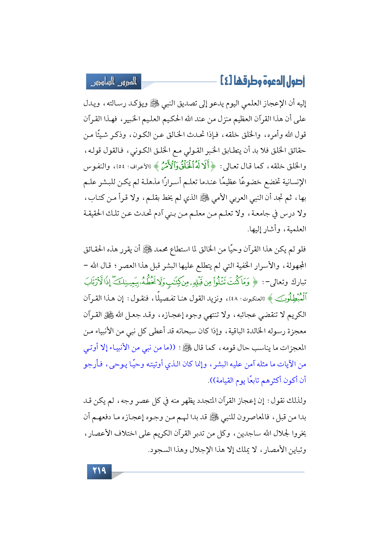إليه أن الإعجاز العلمي اليوم يدعو إلى تصديق النبي -صلى الله عليه وآله وسلم- ويؤكد رسالته، ويدل على أن هذا القرآن العظيم منزل من عند الله الحكيم العليم الخبير، فهذا القرآن قول الله وأمره، والخلق خلقه، فإذا تحدث الخالق عن الكون، وذكر شيئًا من حقائق الخلق فلا بد أن يتطابق الخبر القولي مع الخلق الكوني، فالقول قوله، والخلق خلقه، كما قال تعالى: {أَلا لَهُ الْخَلْقُ والأَمْرُ} (الأعراف: 54)، والنفوس الإنسانية تخضع خضوعًا عظيمًا عندما تعلم أسرارًا مذهلة لم يكن للبشر علم بها، ثم تجد أن النبي العربي الأمي -صلوات الله وسلامه عليه- الذي لم يخط بقلم، ولا قرأ من كتاب، ولا درس في جامعة، ولا تعلم من معلم من بني آدم تحدث عن تلك الحقيقة العلمية، وأشار إليها.