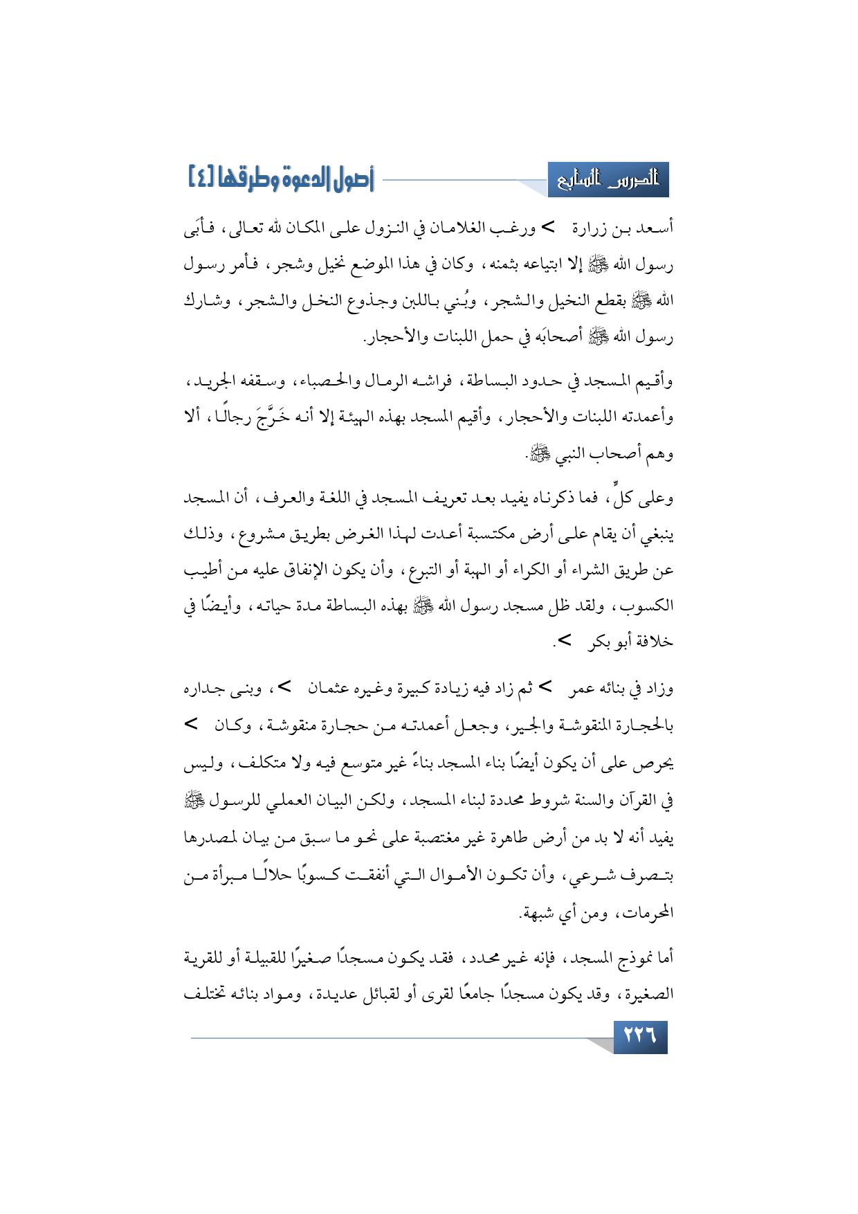 وأقيم المسجد في حدود البساطة، فراشه الرمال والحصباء، وسقفه الجريد، وأعمدته اللبنات والأحجار، وأقيم المسجد بهذه الهيئة -كما ذكرت- إلا أنه خرج رجالًا، ألا وهم أصحاب النبي -صلى الله عليه وآله وسلم.