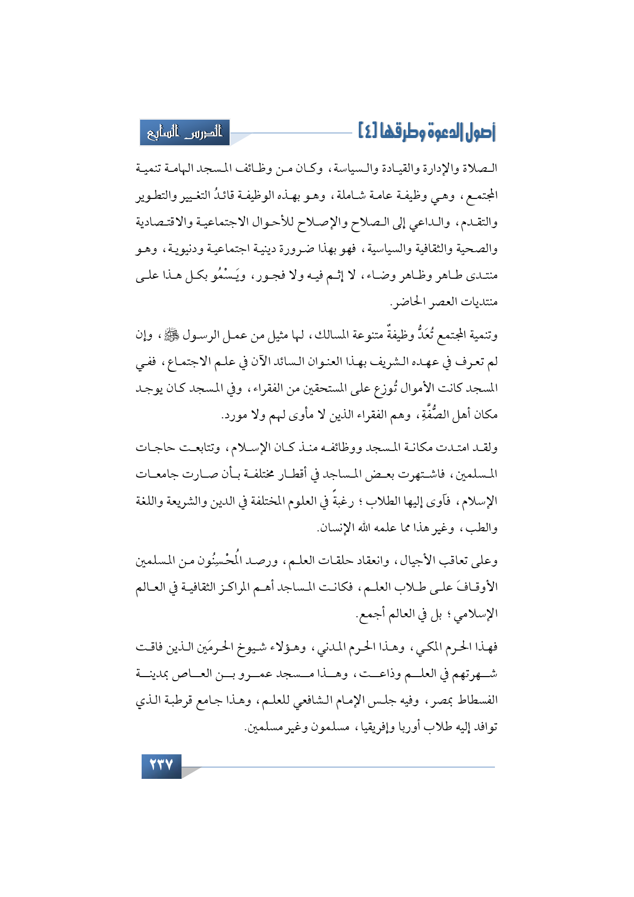 الصلاة والإدارة والقيادة والسياسة، وكان من وظائف المسجد الهامة تنمية المجتمع، وهي وظيفة عامة شاملة، وهو بهذه الوظيفة قائدُ التغيير والتطوير والتقدم، والداعي إلى الصلاح والإصلاح للأحوال الاجتماعية والاقتصادية والصحية والثقافية والسياسية، فهو بهذا ضرورة دينية اجتماعية ودنيوية، وهو منتدى طاهر وظاهر وضاء، لا إثم فيه ولا فجور، ويسمو بكل هذا على نوادي أو منتديات العصر الحاضر.