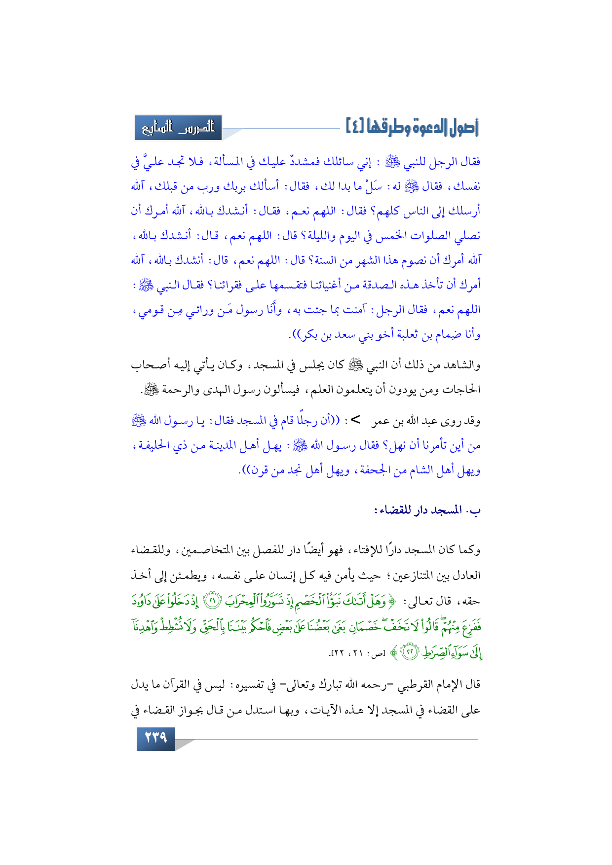 والشاهد من ذلك أن النبي -صلى الله عليه وسلم- كان يجلس في المسجد، وكان يأتي إليه أصحاب الحاجات ومن يودون أن يتعلمون العلم، فيسألون رسول الهدى والرحمة -صلى الله عليه وآله وسلم.