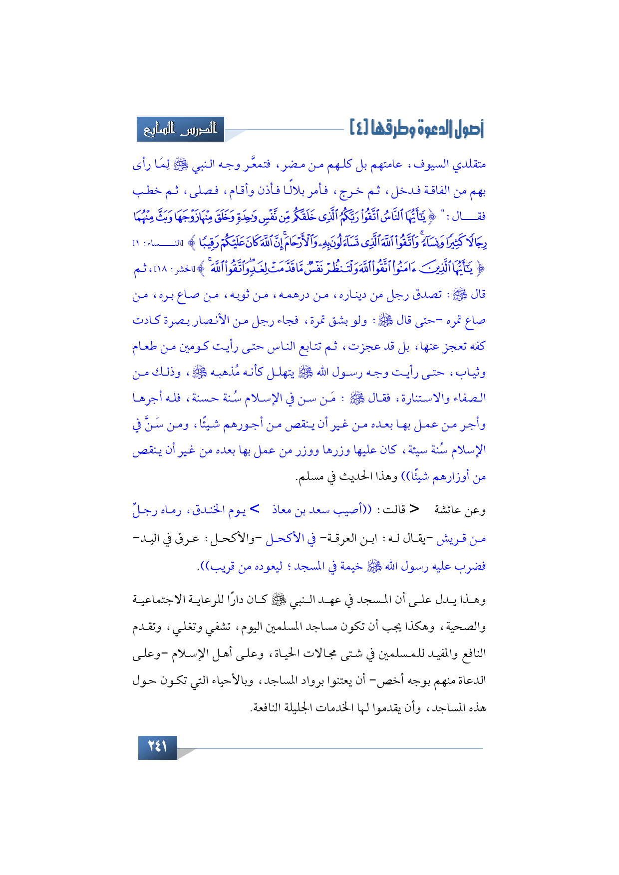 متقلدي السيوف، عامتهم بل كلهم من مضر، فتمعَّر وجه النبي -صلى الله عليه وآله وسلم- لِمَا رأى بهم من الفاقة فدخل، ثم خرج، فأمر بلالًا فأذن وأقام، فصلى، ثم خطب فقال: {يَا أَيُّهَا النَّاسُ اتَّقُوا رَبَّكُمُ الَّذِي خَلَقَكُمْ مِنْ نَفْسٍ وَاحِدَةٍ وَخَلَقَ مِنْهَا زَوْجَهَا وَبَثَّ مِنْهُمَا رِجَالًا كَثِيرًا وَنِسَاءً وَاتَّقُوا اللَّهَ الَّذِي تَتَسَاءَلُونَ بِهِ وَالأَرْحَامَ إِنَّ اللَّهَ كَانَ عَلَيْكُمْ رَقِيبًا} {يَا أَيُّهَا الَّذِينَ آمَنُوا اتَّقُوا اللَّهَ وَلْتَنْظُرْ نَفْسٌ مَا قَدَّمَتْ لِغَدٍ وَاتَّقُوا اللَّهَ} تصدق رجل من ديناره، من درهمه، من ثوبه، من صاع بره، من صاع تمره -حتى قال -صلى الله عليه وسلم-: ولو بشق تمرة، فجاء رجل من الأنصار بِصرة كادت كفه تعجز عنها، بل قد عجزت، ثم تتابع الناس حتى رأيت كومين من طعام وثياب، حتى رأيت وجه رسول الله -صلى الله عليه وآله وسلم- يتهلل كأنه مُذهبه -صلى الله عليه وآله وسلم- وذلك من الصفاء والاستنارة، فقال رسول الله -صلى الله عليه وآله وسلم-: مَن سن في الإسلام سنه حسنة، فله أجرها وأجر من عمل بها بعده من غير أن ينقص من أجورهم شيئًا، ومن سن في الإسلام سنة سيئة، كان عليها وزرها ووزر من عمل بها بعده من غير أن ينقص من أوزارهم شيئًا)) وهذا الحديث في مسلم.