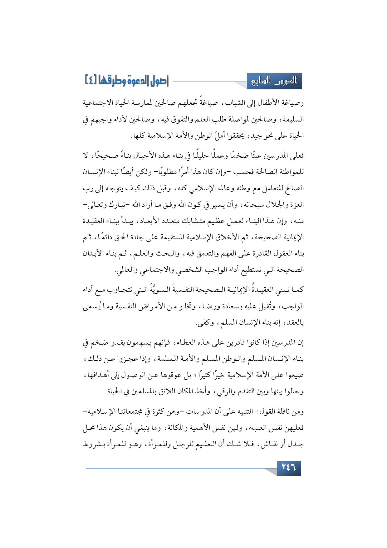 ومن نافلة القول: التنبيه على أن المدرسات -وهن كثرة كاسرة في مجتمعاتنا الإسلامية- عليهن نفس العبء، ولهن نفس الأهمية والمكانة، وما ينبغي أن يكون هذا محل جدل أو نقاش، فلا شك أن التعليم للرجل وللمرأة، وهو للمرأة بشروط