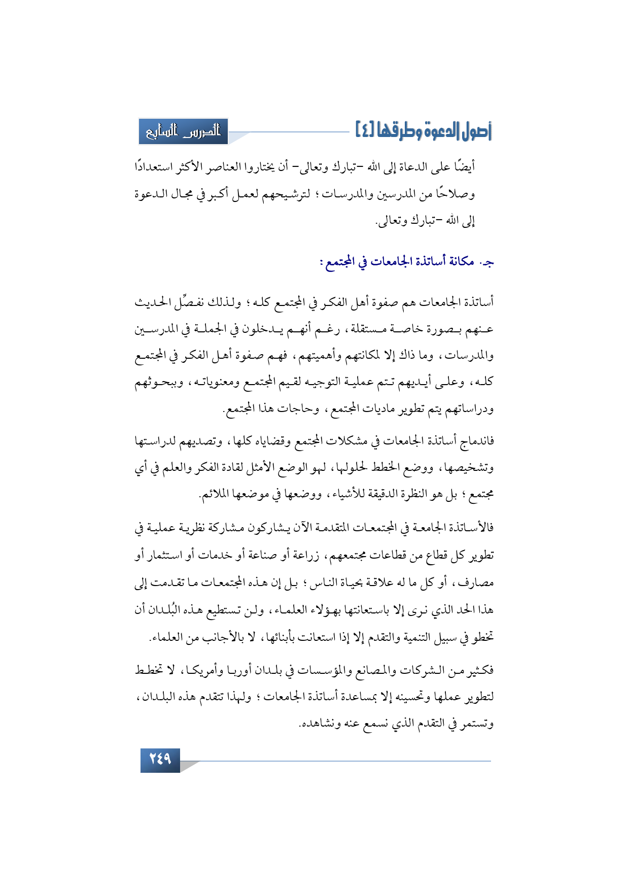 أساتذة الجامعات هم صفوة أهل الفكر في المجتمع كله، ولذلك أود أن أفصِّل الحديث عنهم بصورة خاصة مستقلة، رغم أنهم يدخلون في الجملة في المدرسين والمدرسات، وما ذاك إلا لمكانتهم وأهميتهم، فهم -كما ذكرت- صفوة أهل الفكر في المجتمع كله، وعلى أيديهم تتم عملية التوجيه لقيم المجتمع ومعنوياته، وببحوثهم ودراساتهم يتم تطوير ماديات المجتمع، وحاجات هذا المجتمع.