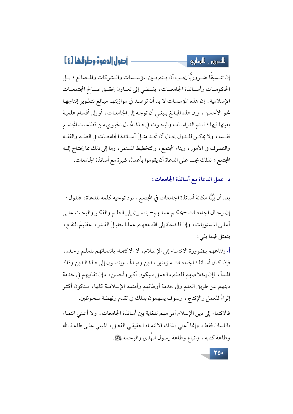 ولذلك يجب على الدعاة أن يقوموا بأعمال كبيرة مع أساتذة الجامعات، وهذا ما سأبينه في النقطة التالية في هذا العنصر، وهي: