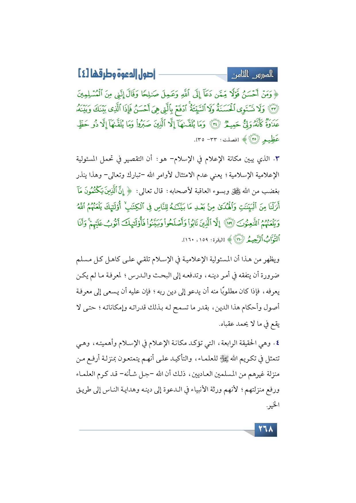 رابعًا: وهي الحقيقة الرابعة، التي تؤكد مكانة الإعلام في الإسلام وأهميته وهي تتمثل في تكريم الله -سبحانه وتعالى- للعلماء، والتأكيد على أنهم يتمتعون بمنزلة أرفع من منزلة غيرهم من المسلمين العاديين ذلك أن الله -جل شأنه- قد كرم العلماء ورفع منزلتهم؛ لأنهم ورثة الأنبياء في الدعوة إلى دينه وهداية الناس إلى طريق الخير.