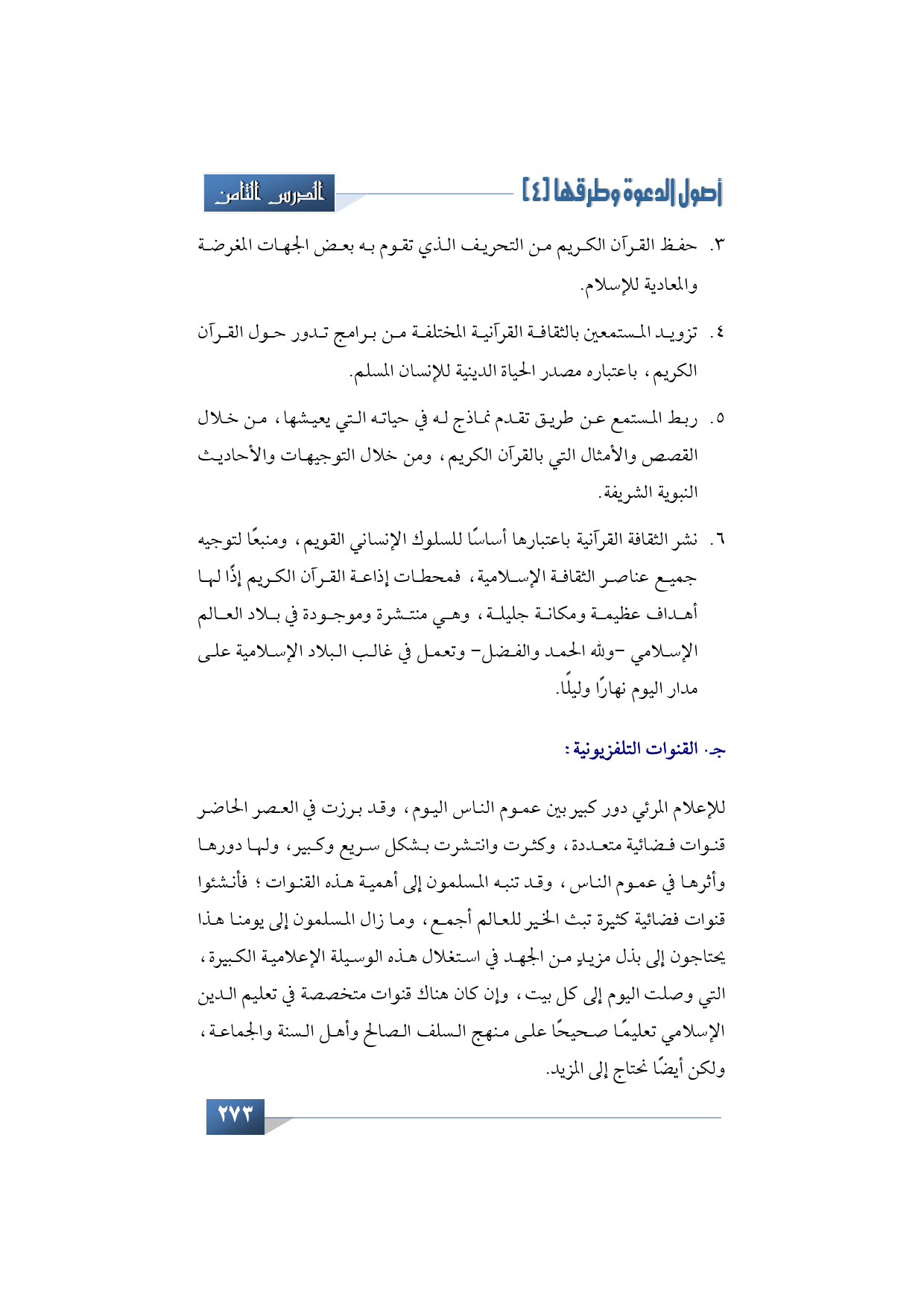 لقد كان للإعلام المرئي دور كبير بين عموم الناس اليوم، وقد برزت في العصر الحاضر قنوات فضائية متعددة، وكثرت وانتشرت بشكل سريع وكبير، ولها دورها وأثرها في عموم الناس، وقد تنبه المسلمون إلى أهمية هذه القنوات؛ فأنشئوا قنوات فضائية كثيرة تبث الخير للعالم أجمع، وما زال المسلمون إلى يومنا هذا يحتاجون -وأقولها نصيحة لله -تبارك وتعالى- إلى بذل مزيدٍ من الجهد في استغلال هذه الوسيلة الإعلامية الكبيرة، التي وصلت اليوم إلى كل بيت، وإن كان -وللحق أقول- هناك قنوات متخصصة في تعليم الدين الإسلامي تعليمًا صحيحًا على منهج السلف الصالح وأهل السنة والجماعة، ولكن أيضًا نحتاج إلى المزيد.
