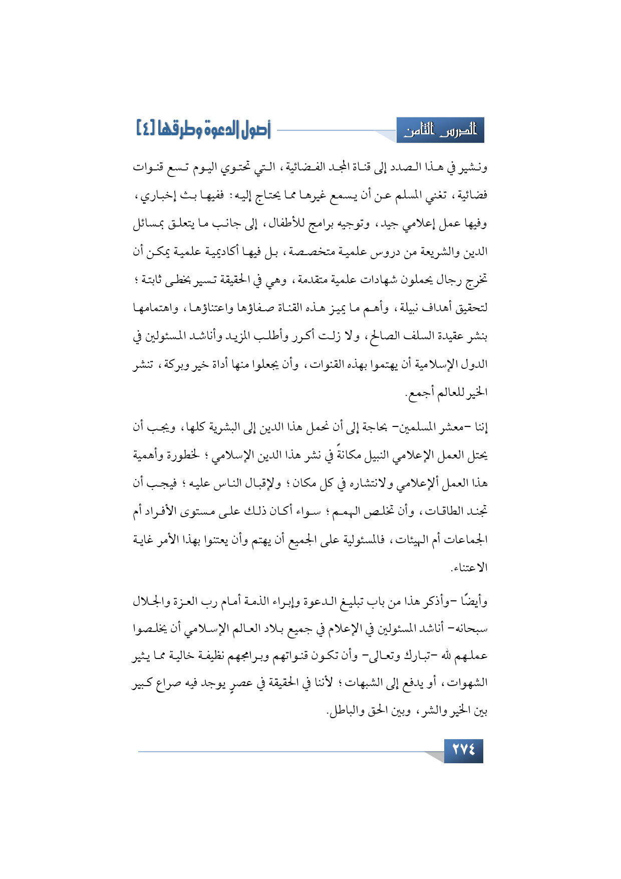 إننا -معشر المسلمين- بحاجة إلى أن نحمل هذا الدين إلى البشرية كلها، وإن العمل الإعلامي النبيل يجب أن يحتل مكانة في نشر هذا الدين الإسلامي؛ لخطورته ولأهميته ولانتشاره في كل مكان؛ ولإقبال الناس عليه؛ فيجب أن تجند الطاقات، وأن تخلص الدول، سواء كان ذلك على مستوى الأفراد أو الجماعات أو الهيئات: المسئولية فيها على الجميع، أن يهتم وأن يعتني بهذا الأمر غاية الاعتناء.