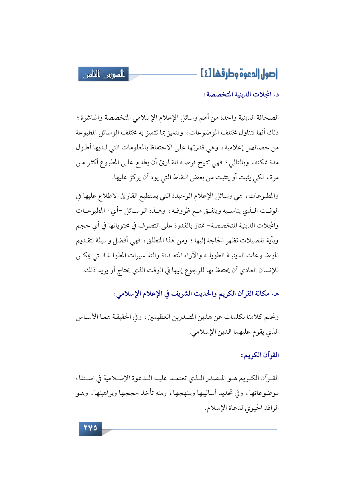 هـ- مكانة القرآن الكريم والحديث الشريف في الإعلام الإسلامي: