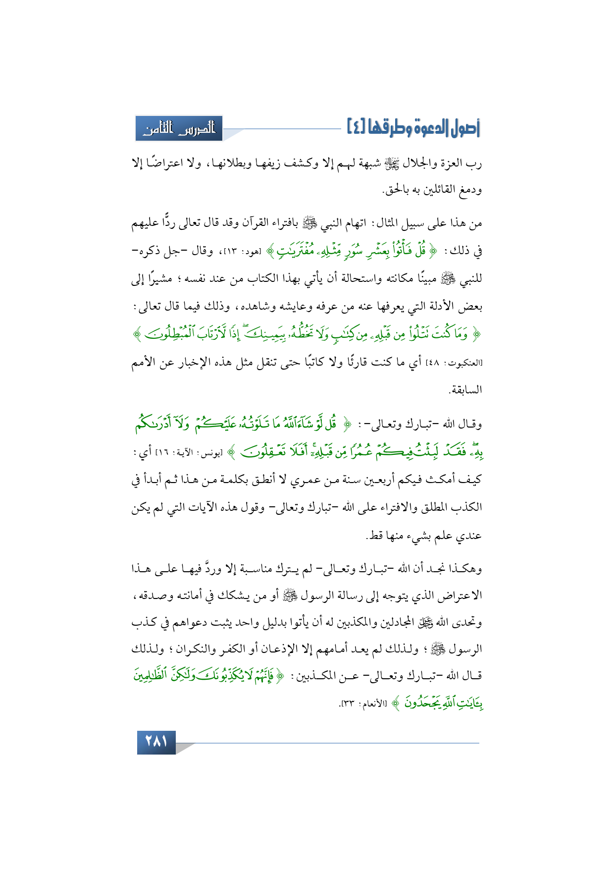 وقال الله -تبارك وتعالى-: {قُلْ لَوْ شَاءَ اللَّهُ مَا تَلَوْتُهُ عَلَيْكُمْ وَلا أَدْرَاكُمْ بِهِ فَقَدْ لَبِثْتُ فِيكُمْ عُمُرًا مِنْ قَبْلِهِ أَفَلا تَعْقِلُونَ} (يونس: الآية: 16) أي: كيف أمكث فيكم أربعين سنة من عمري لا أنطق بكلمة من هذا ثم أبدأ في الكذب المطلق والافتراء على الله -تبارك وتعالى- وقول هذه الآيات التي لم يكن عندي علم بشيء منها قط.
