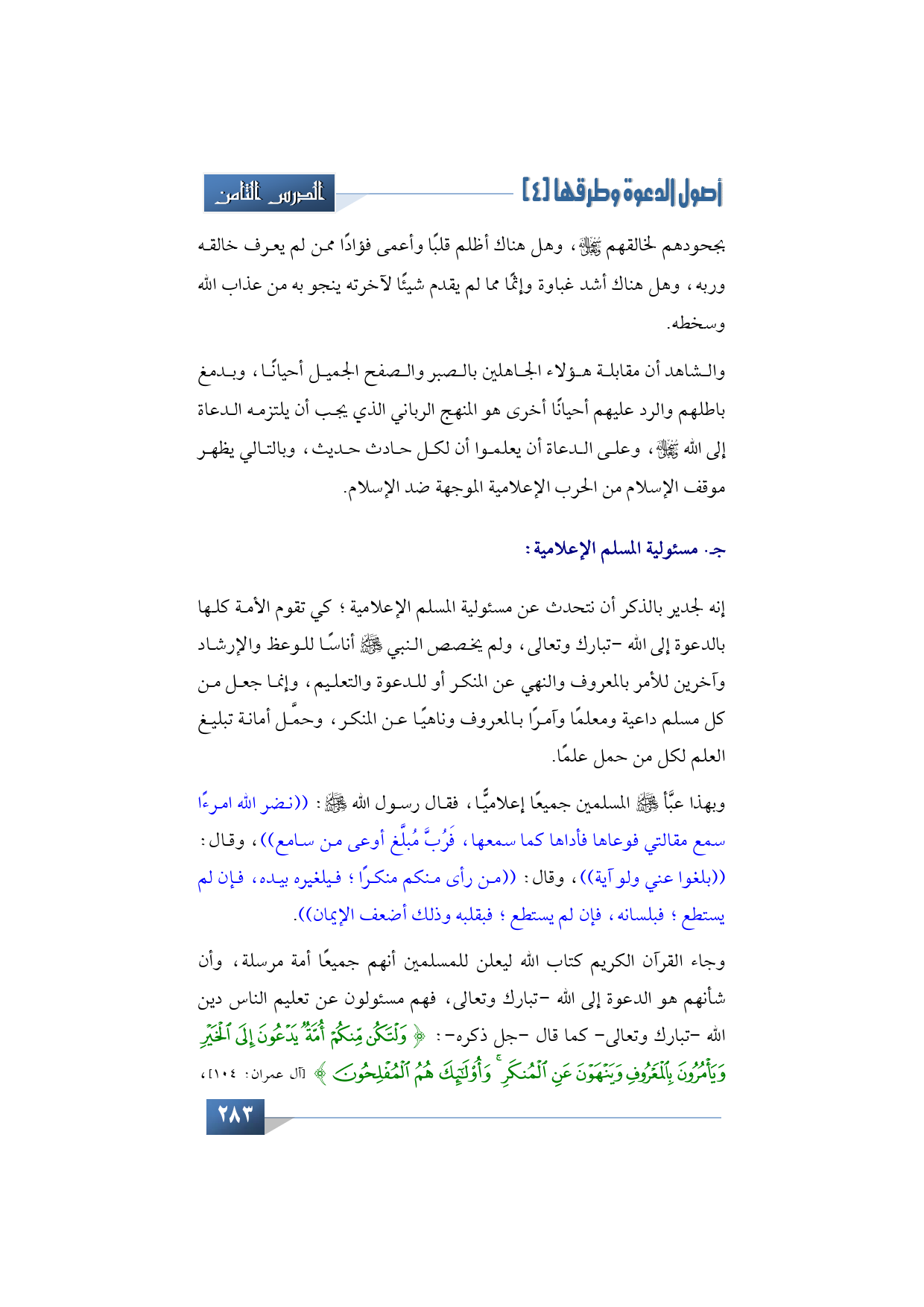 وجاء القرآن الكريم كتاب الله ليعلن للمسلمين أنهم جميعًا أمة مرسلة، وأن شأنهم هو الدعوة إلى الله -تبارك وتعالى، فهم مسئولون عن تعليم الناس دين الله -تبارك وتعالى- كما قال -جل ذكره-: {وَلْتَكُنْ مِنْكُمْ أُمَّةٌ يَدْعُونَ إِلَى الْخَيْرِ وَيَأْمُرُونَ بِالْمَعْرُوفِ وَيَنْهَوْنَ عَنِ الْمُنْكَرِ وَأُوْلَئِكَ هُمُ الْمُفْلِحُونَ}