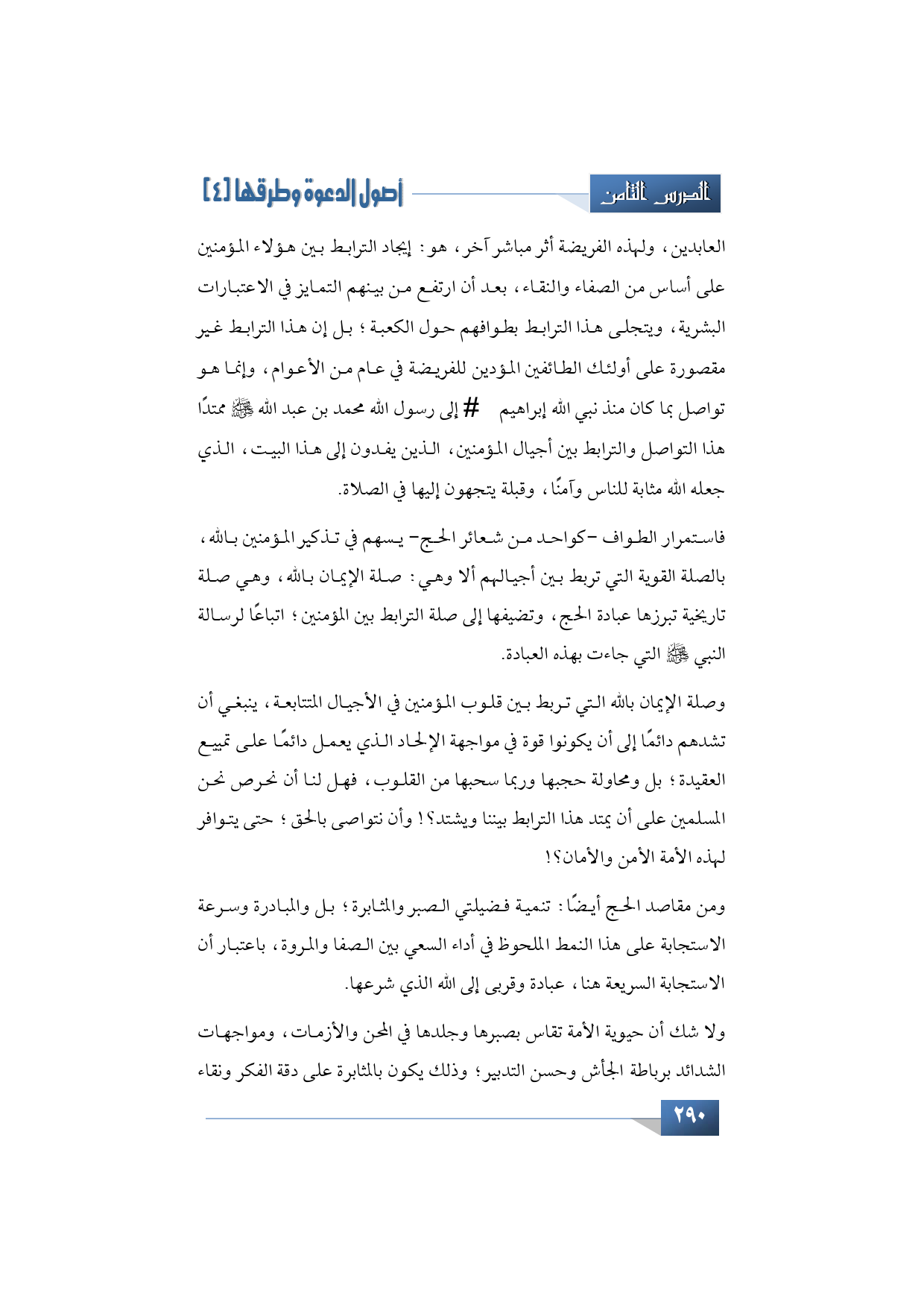 العابدين، ولهذه الفريضة أثر مباشر آخر، هو: إيجاد الترابط بين هؤلاء المؤمنين على أساس من الصفاء والنقاء، بعد أن ارتفع من بينهم التمايز في الاعتبارات البشرية، ويتجلى هذا الترابط بطوافهم حول الكعبة؛ بل إن هذا الترابط غير قاصر على أولئك الطائفين المؤدين للفريضة في عام من الأعوام، وإنما هو تواصل بما كان منذ نبي الله إبراهيم -عليه السلام- إلى رسول الله محمد بن عبد الله -صلى الله عليه وآله وسلم- ممتدًا هذا التواصل والترابط بين أجيال المؤمنين، الذين يفدون إلى هذا البيت، الذي جعله الله مثابة للناس وآمنًا، وقبلة يتجهون إليها في الصلاة.