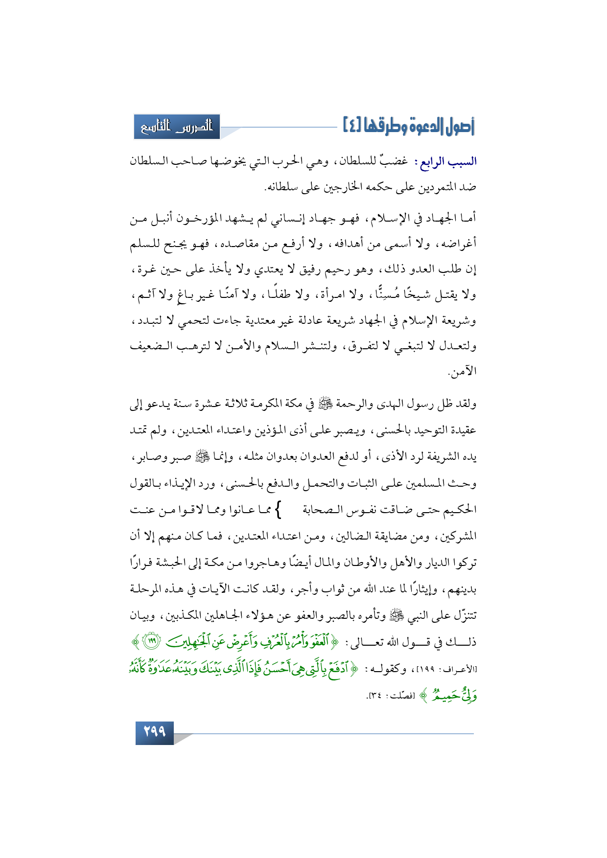 ولقد ظل رسول الهدى والرحمة -صلى الله عليه وآله وسلم- في مكة المكرمة ثلاثة عشرة سنة يدعو إلى عقيدة التوحيد بالحسنى، ويصبر على أذى المؤذين واعتداء المعتدين، ولم تمتد يده الشريفة لرد الأذى، أو لدفع العدوان بعدوان مثله، وإنما -صلى الله عليه وآله وسلم- صبر وصابر، وحث المسلمين على الثبات والتحمل والدفع بالحسنى، ورد الإيذاء بالقول الحكيم حتى ضاقت نفوس الصحابة -رضوان الله عليهم- مما عانوا ومما لاقوا من عنت المشركين، ومن مضايقة الضالين، ومن اعتداء المعتدين، فما كان منهم إلا أن تركوا الديار والأهل والأوطان والمال أيضًا، تركوا ملاعب الصبًا ومرتع الشباب، تركوا الأحبة والأصحاب، وهان عليهم المال والممتلكات؛ فهاجروا من مكة إلى الحبشة مرتين فرارًا بدينهم، وإيثارًا لما عند الله من ثواب وأجر، ولقد كانت الآيات في هذه المرحلة تتنزّل على النبي -صلى الله عليه وآله وسلم- وتأمره بالصبر والعفو عن هؤلاء الجاهلين المكذبين، وبيان ذلك في قول الله تعالى مثلًا: {خُذِ الْعَفْوَ وَأْمُرْ بِالْعُرْفِ وَأَعْرِضْ عَنِ الْجَاهِلِينَ} (الأعراف: 199) وكقوله: {ادْفَعْ بِالَّتِي هِيَ أَحْسَنُ فَإِذَا الَّذِي بَيْنَكَ وَبَيْنَهُ عَدَاوَةٌ كَأَنَّهُ وَلِيٌّ حَمِيمٌ} (فصّلت: 34).